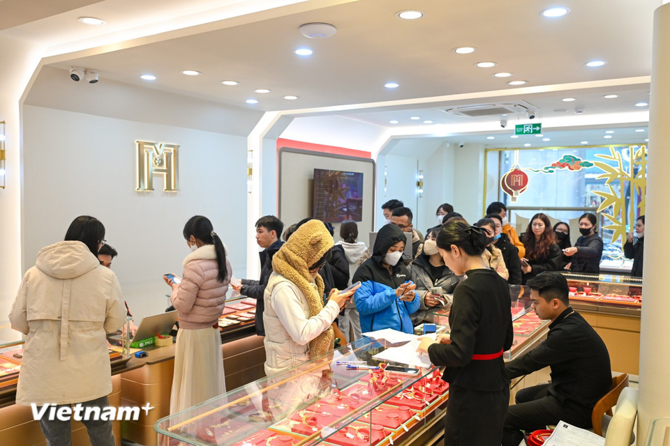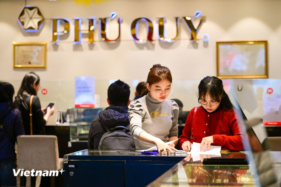 Với nhu cầu tăng mạnh và nguồn cung hạn chế, thị trường vàng đang bước vào giai đoạn cao điểm nhất trong năm. Các doanh nghiệp kinh doanh vàng vừa phải đáp ứng nhu cầu mua sắm, vừa phải đảm bảo an toàn vận hành, kiểm soát tồn kho và trật tự cửa hàng. (Ảnh: Minh Sơn/Vietnam+)
