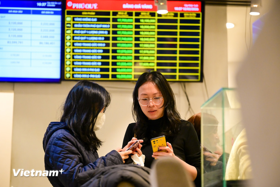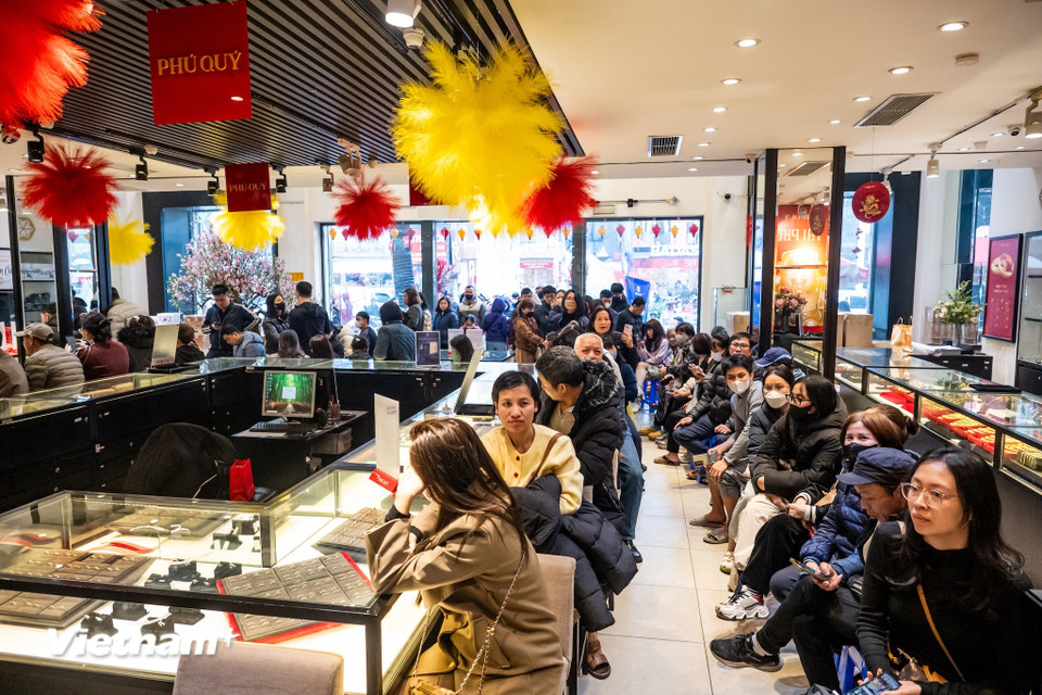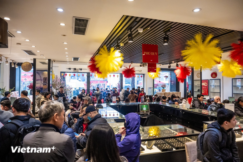 Tại chi nhánh Phú Quý trên đường Cầu Giấy, dòng người xếp hàng kín khu vực trước cửa. Nhân viên phải liên tục hướng dẫn, phân luồng khách hàng, nhưng lượng người đến mua vẫn không ngừng tăng. (Ảnh: Minh Sơn/Vietnam+)