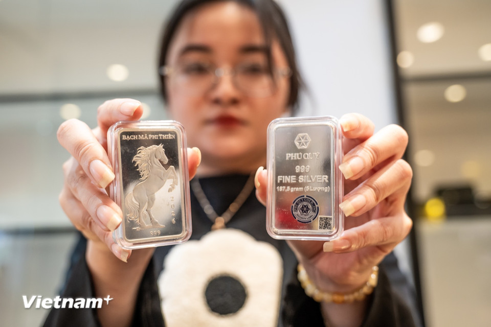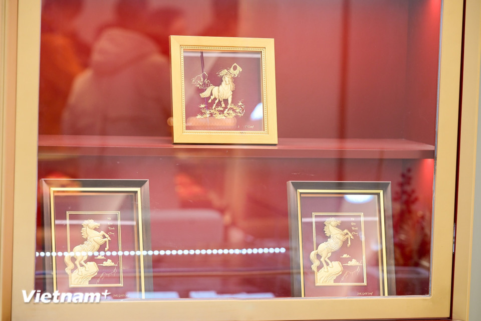 Đại diện Phú Quý cho biết, chào đón năm Bính Ngọ 2026, đơn vị này đã ra mắt bộ sưu tập các sản phẩm mang hình tượng ngựa (Mã) bao gồm bạc miếng 999, linh vật ngựa dát vàng, và các dòng tranh ngựa mạ vàng. (Ảnh: Minh Sơn/Vietnam+)