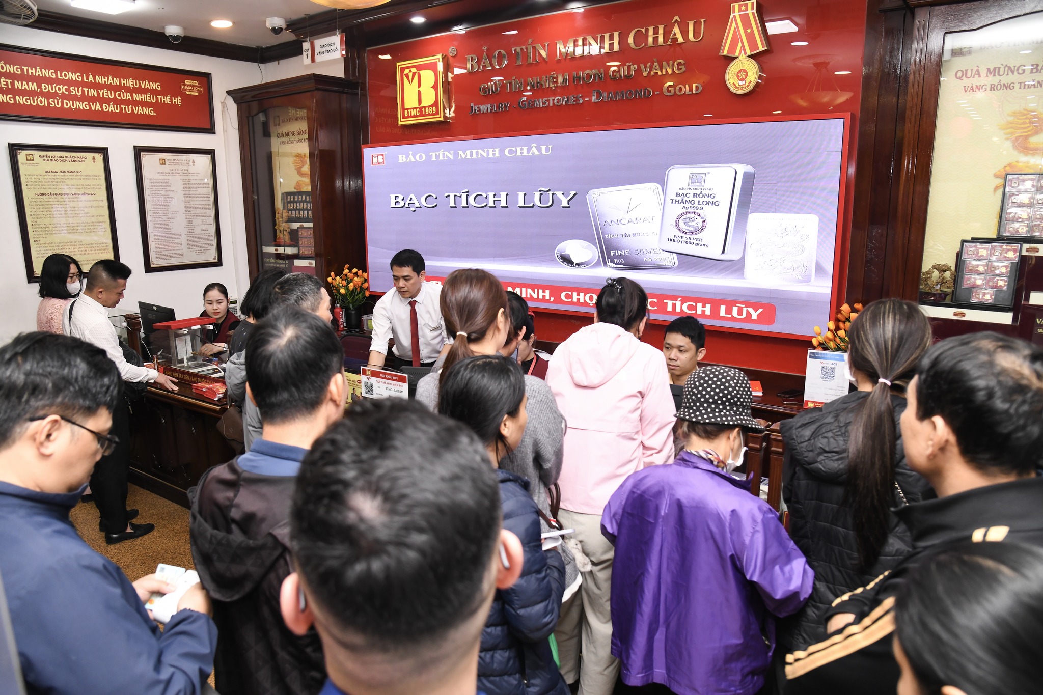 Người dân xếp hàng giao dịch, dòng người nối dài, chờ đến lượt mua bán trong không khí nhộn nhịp.
