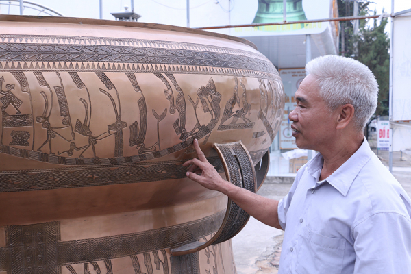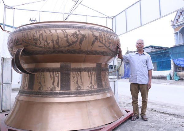 Nghệ nhân Nguyễn Bá Châu bên chiếc trống đồng lớn nhất do chính tay ông dày công chế tác