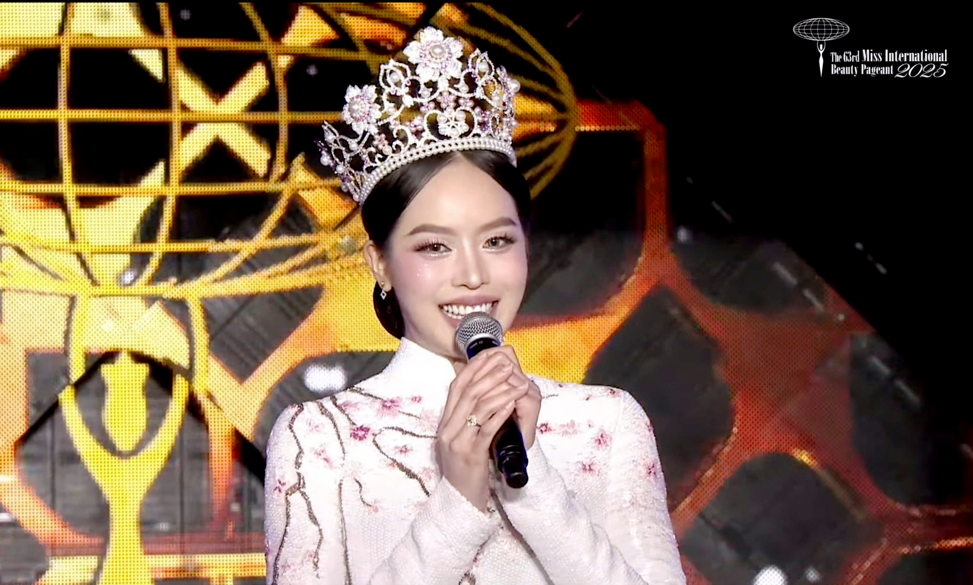 Trong chung kết Hoa hậu Quốc tế 2025, Thanh Thủy xúc động chia sẻ hành trình 1 năm đăng quang bằng tiếng Anh, tiếng Việt và tiếng Nhật. Cô đặc biệt nhấn mạnh luôn tự hào là người Việt Nam, đề cao màu cờ sắc áo khi đến bất kỳ nơi đâu.