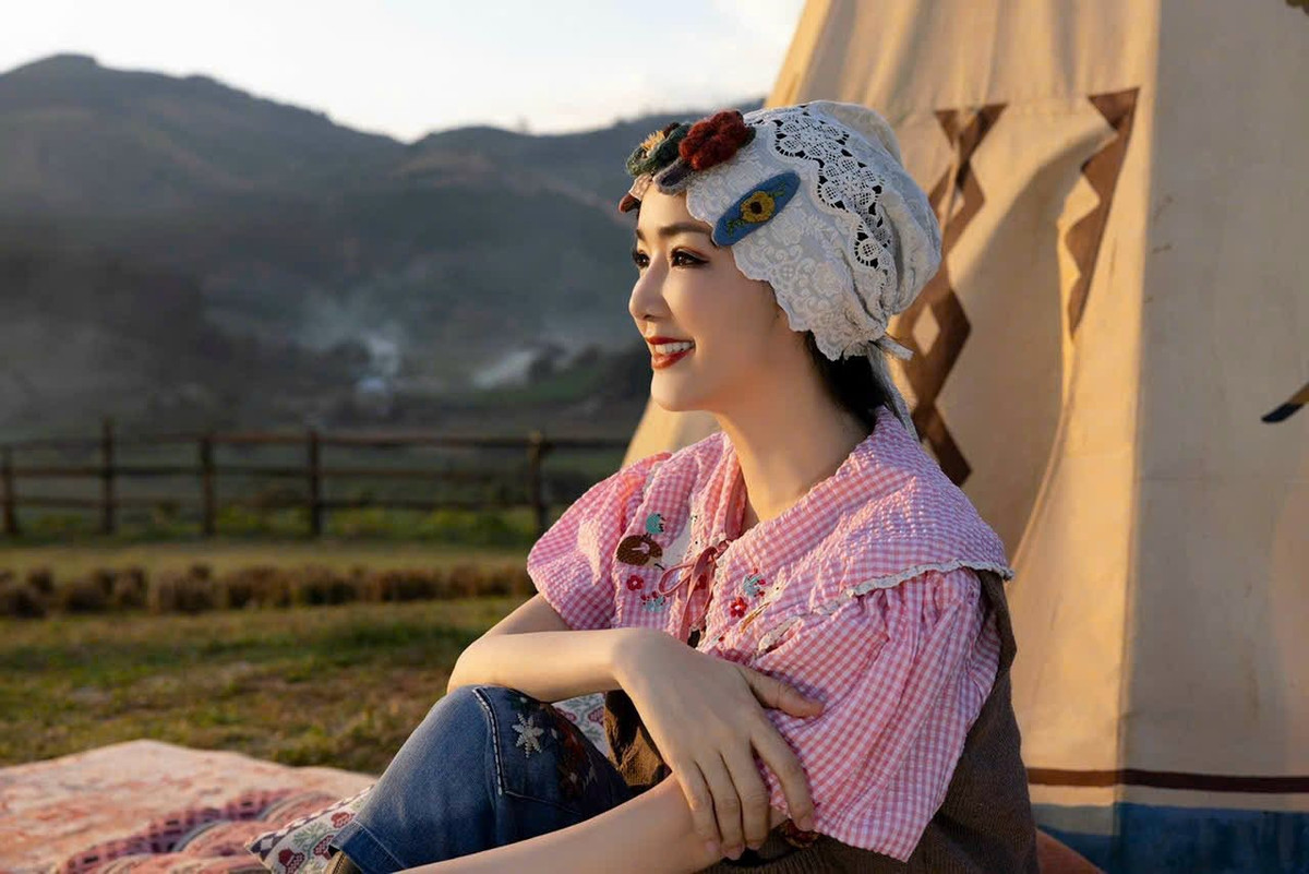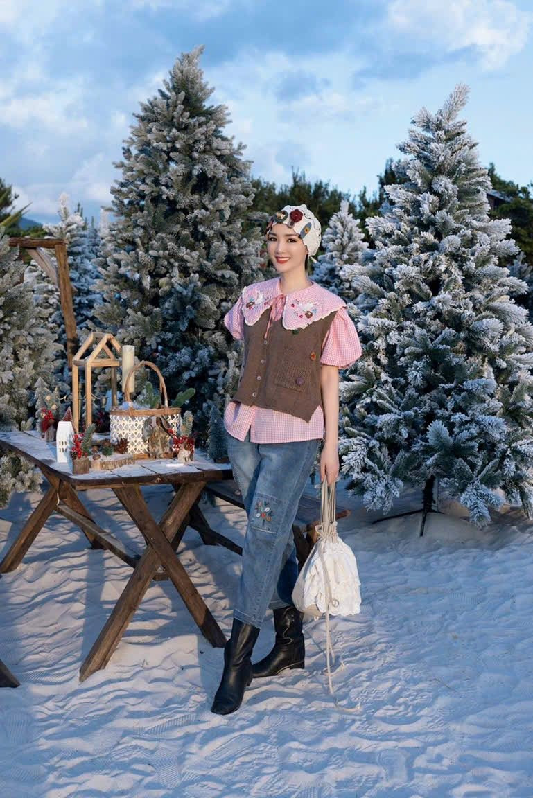 Trong bộ ảnh, Giáng My xuất hiện với áo sơ mi caro hồng phấn phối cùng áo gile nâu, quần jeans và boots cổ thấp. Điểm nhấn nằm ở chiếc mũ ren trắng đính họa tiết thủ công, tạo cảm giác vừa cổ điển vừa ấm áp đúng tinh thần Giáng sinh.