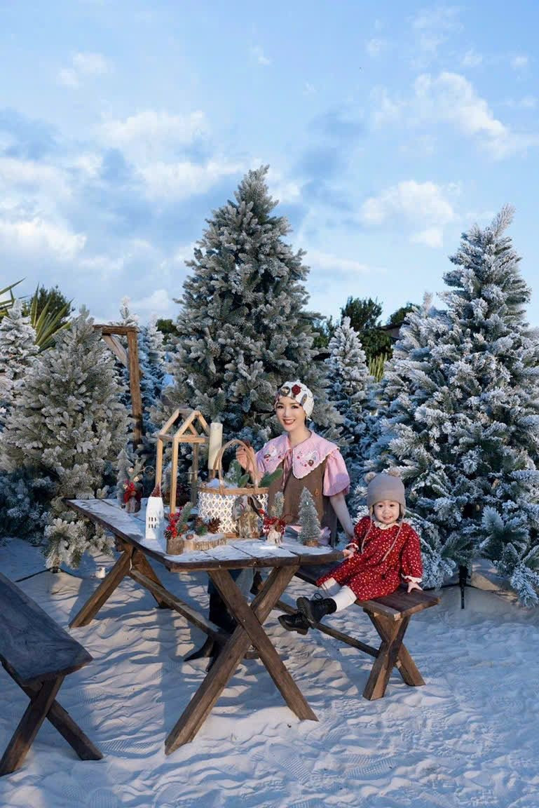 Giữa khung cảnh rừng thông phủ tuyết, bàn gỗ nhỏ bày nến, giỏ mây và những món decor Noel, Hoa hậu Đền Hùng toát lên vẻ đẹp dịu dàng, an yên như bước ra từ một câu chuyện mùa đông.