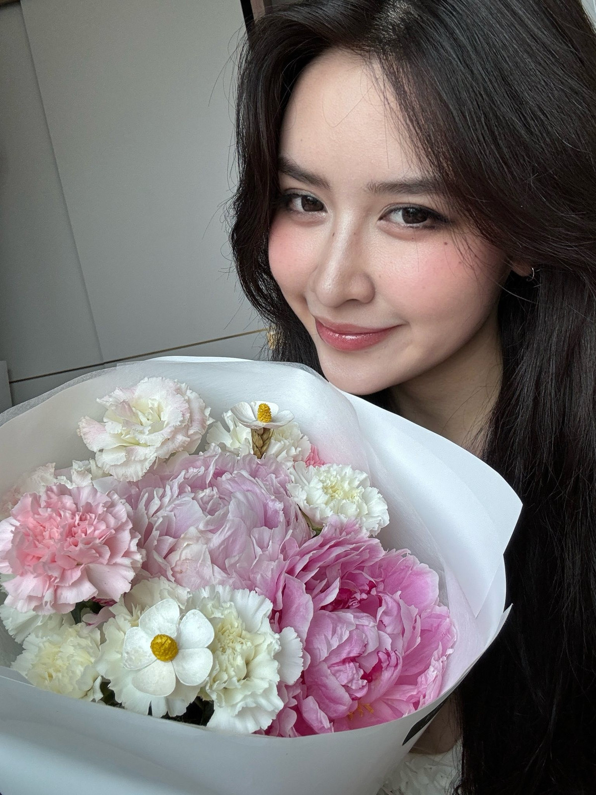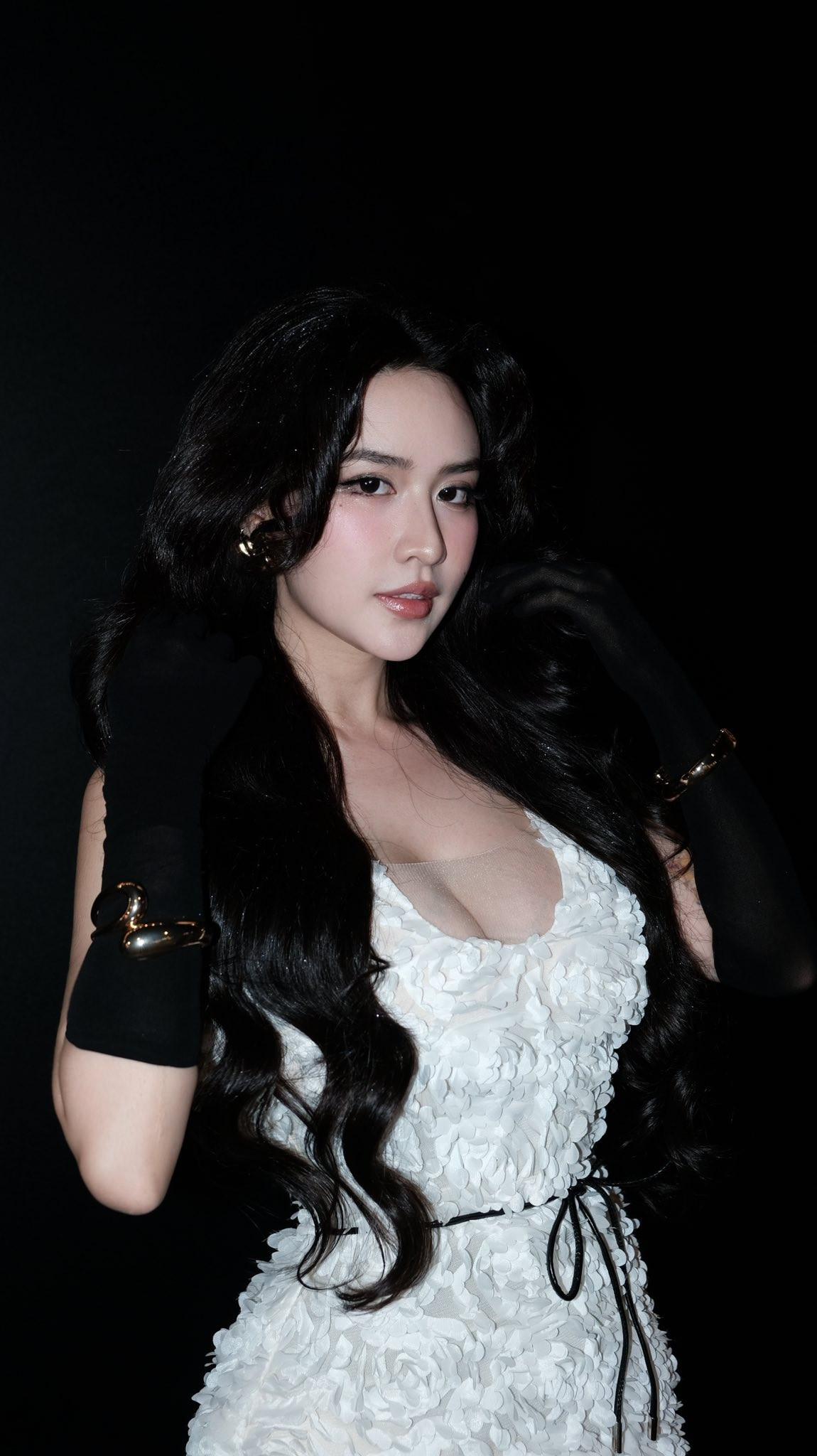 Làn da trắng mịn, gương mặt V-line cùng đôi môi hồng căng bóng mang lại vẻ đẹp vừa ngọt ngào vừa sắc sảo. Mái tóc đen uốn lọn dài buông nhẹ tạo cảm giác cổ điển, sang trọng, gợi nhớ hình ảnh các minh tinh châu Á thập niên 90.