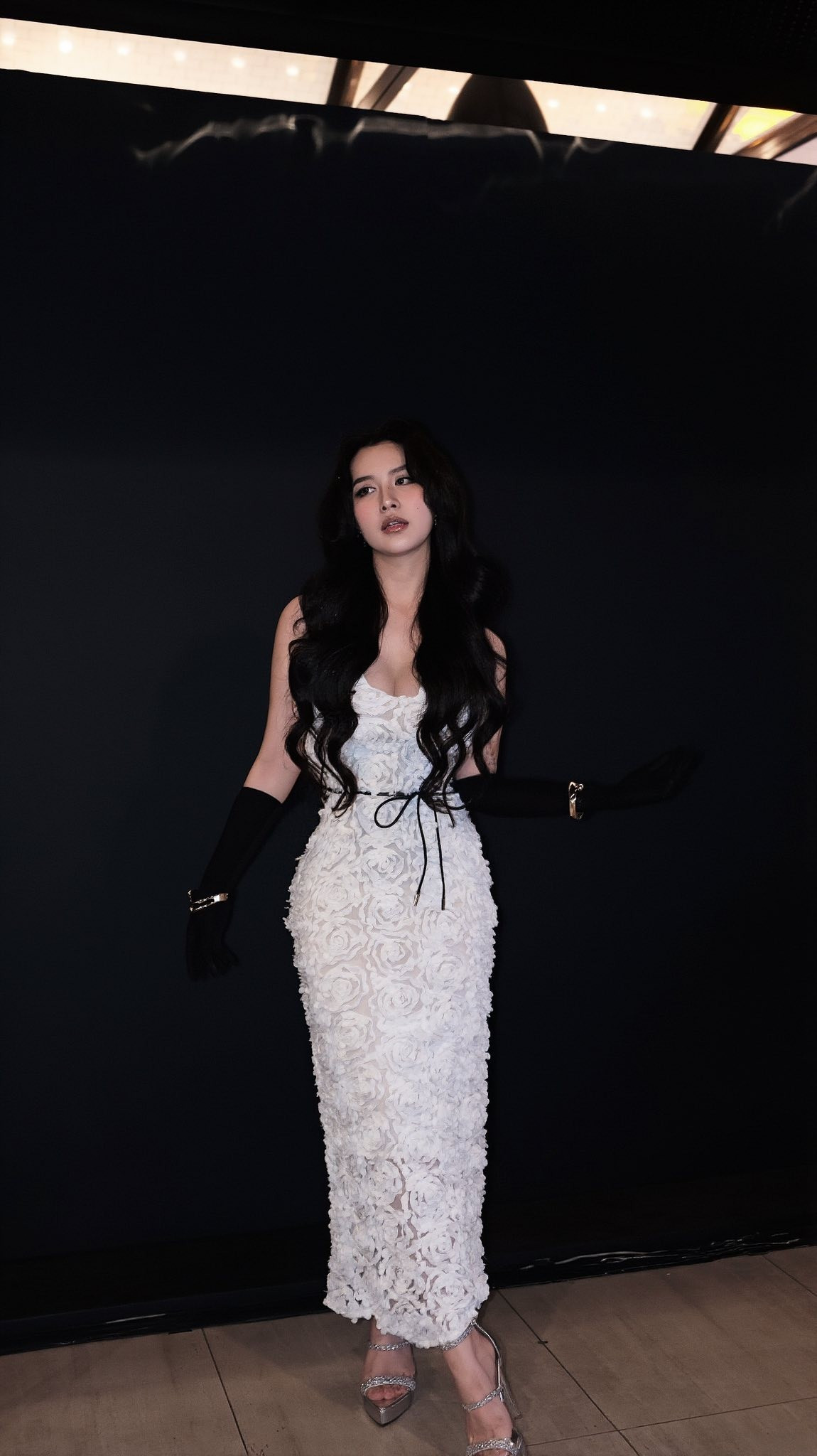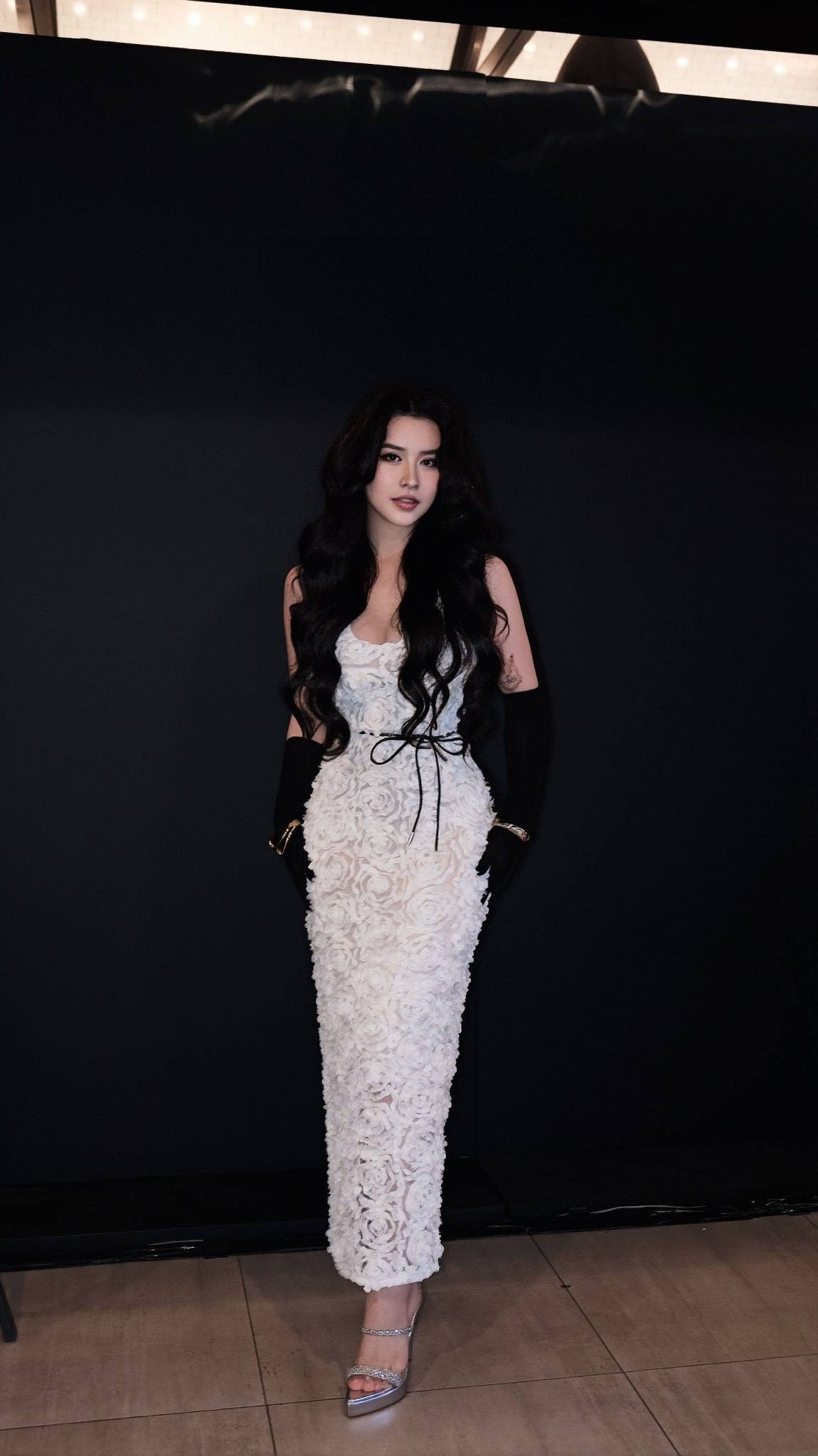 Điểm nhấn thú vị là đôi găng tay đen dáng dài kết hợp cùng vòng tay vàng, tạo sự đối lập màu sắc đầy nghệ thuật. Mỗi chuyển động và ánh nhìn của cô đều toát lên vẻ tự tin, trưởng thành và quyến rũ.