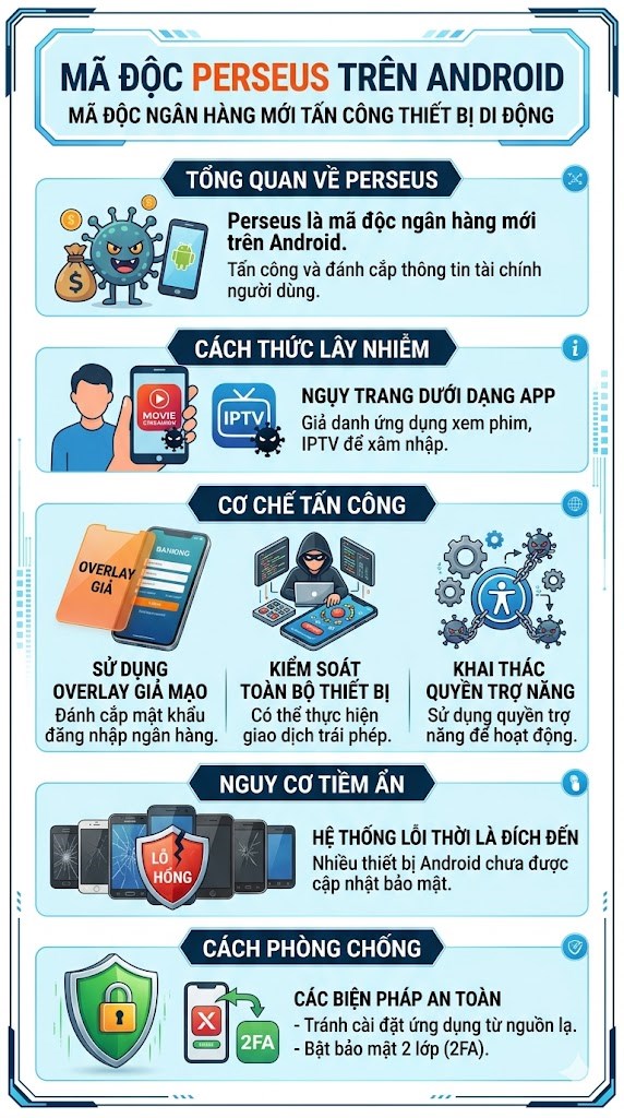Một biến thể mã độc ngân hàng mới mang tên Perseus đang khiến cộng đồng an ninh mạng đặc biệt lo ngại khi nhắm trực tiếp vào người dùng Android. Không chỉ đánh cắp mật khẩu, mã độc này còn có thể chiếm quyền điều khiển thiết bị và thực hiện giao dịch trái phép, đe dọa trực tiếp đến tài khoản tài chính của người dùng.