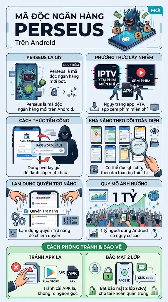 Một biến thể mã độc ngân hàng mới mang tên Perseus đang khiến giới an ninh mạng đặc biệt lo ngại khi nhắm trực tiếp vào người dùng Android. Với khả năng đánh cắp mật khẩu, chiếm quyền điều khiển thiết bị và thực hiện giao dịch trái phép, Perseus được đánh giá là một trong những mối đe dọa nguy hiểm nhất hiện nay.