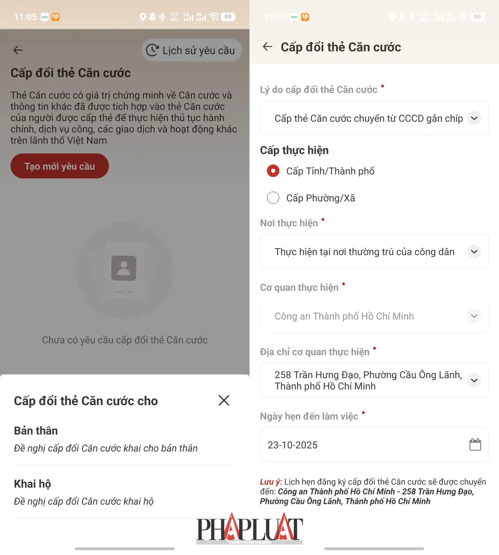 Trong trang mới hiện ra, bạn hãy chọn cấp thẻ căn cước cho bản thân hoặc khai hộ, điền đầy đủ các thông tin cá nhân cần thiết, chọn cơ quan thực hiện và ngày hẹn làm việc.