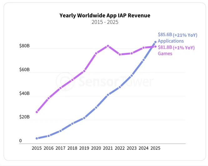 Năm 2025, lần đầu người dùng chi nhiều hơn cho ứng dụng phi trò chơi so với game. Ảnh: Sensor Tower