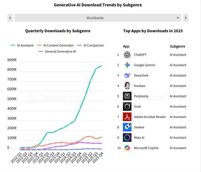 Nhu cầu về trợ lý ảo bùng nổ khi toàn bộ top 10 ứng dụng được tải nhiều nhất đều thuộc danh mục này, dẫn đầu bởi ChatGPT (OpenAI), Gemini (Google) và DeepSeek. Riêng ChatGPT đã mang về 3,4 tỷ USD doanh thu toàn cầu.