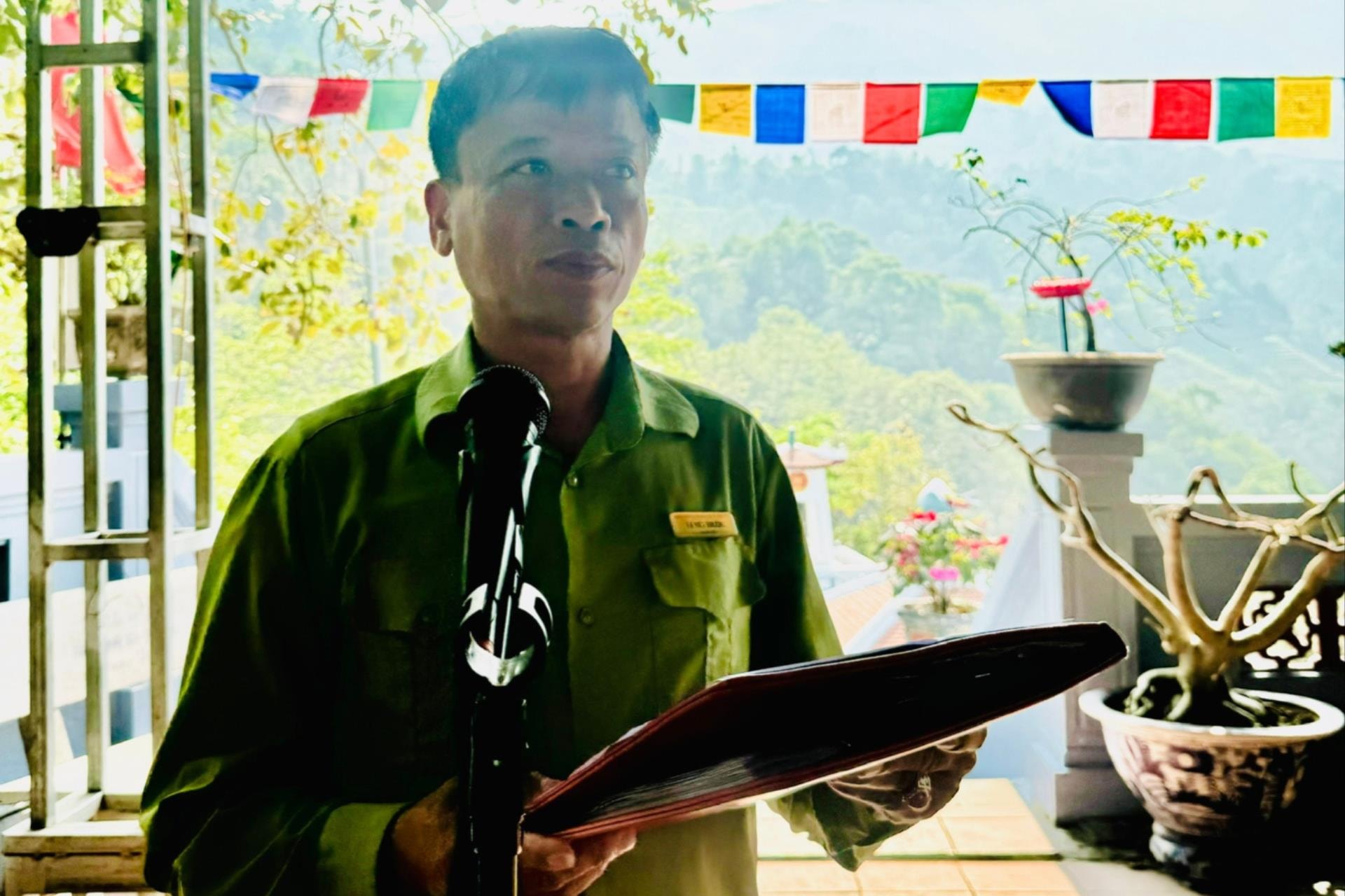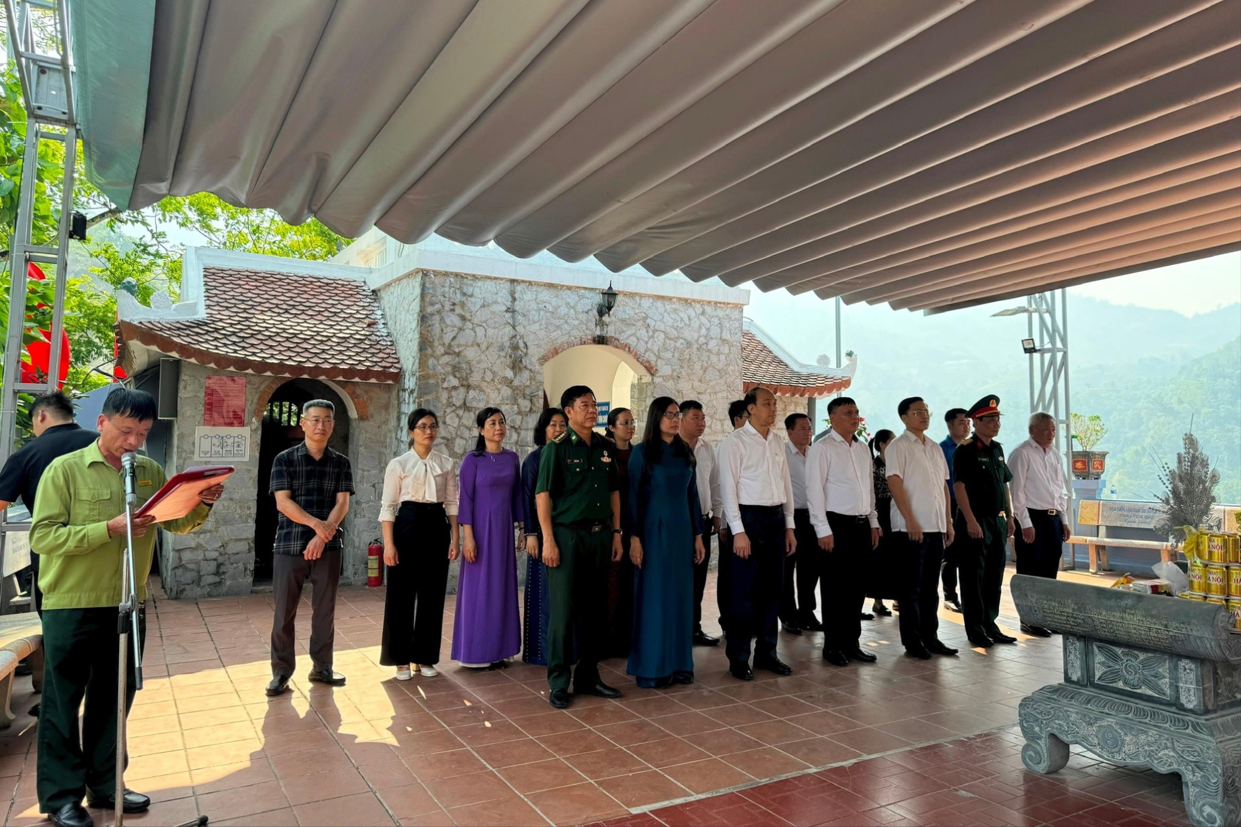 Anh Tạ Viết Trường nghiêm trang đọc Lời kính cáo trước thời khắc các đoàn dâng hương tưởng niệm tại Đền thờ các anh hùng liệt sĩ mặt trận Vị Xuyên tại Điểm cao 468, xã Thanh Thủy, tỉnh Tuyên Quang. Ảnh: Mai Hoa