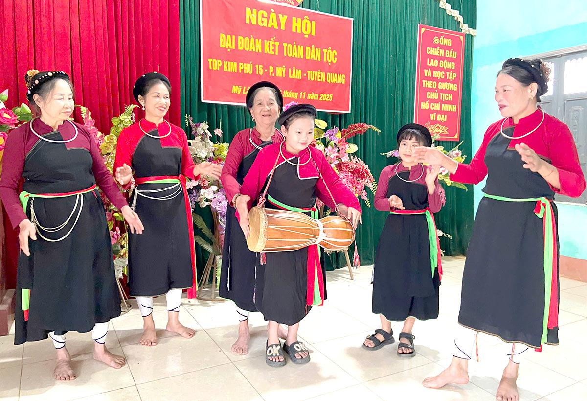 Các thành viên CLB giữ gìn bản sắc văn hóa dân tộc Cao Lan, thôn Kim Phú 15, phường Mỹ Lâm biểu diễn điệu múa Khai đèn.