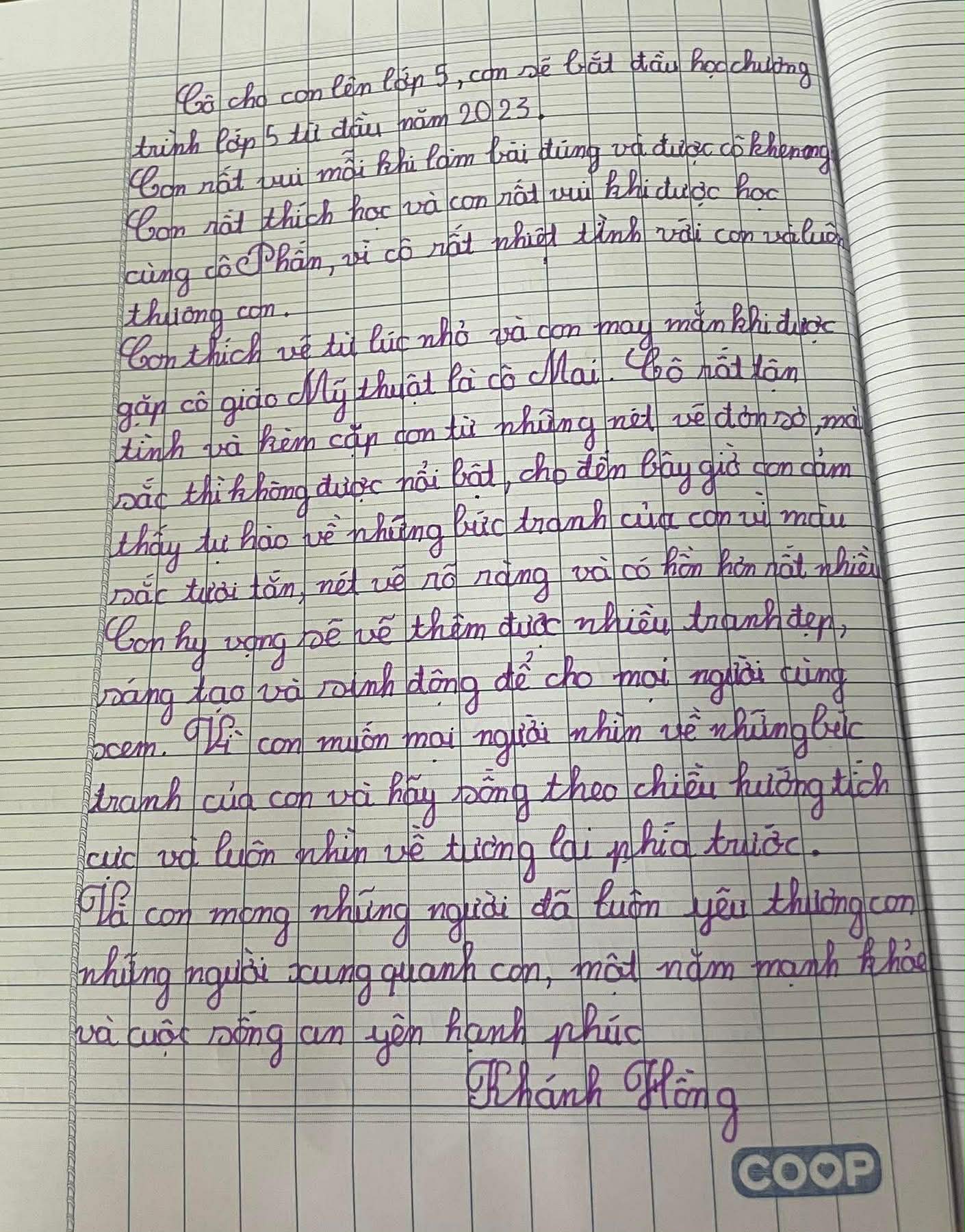 Những dòng chữ đầy cảm xúc của bé Khánh Hồng khi viết về cô Phấn và cô giáo dạy Mỹ thuật. Ảnh: NVCC