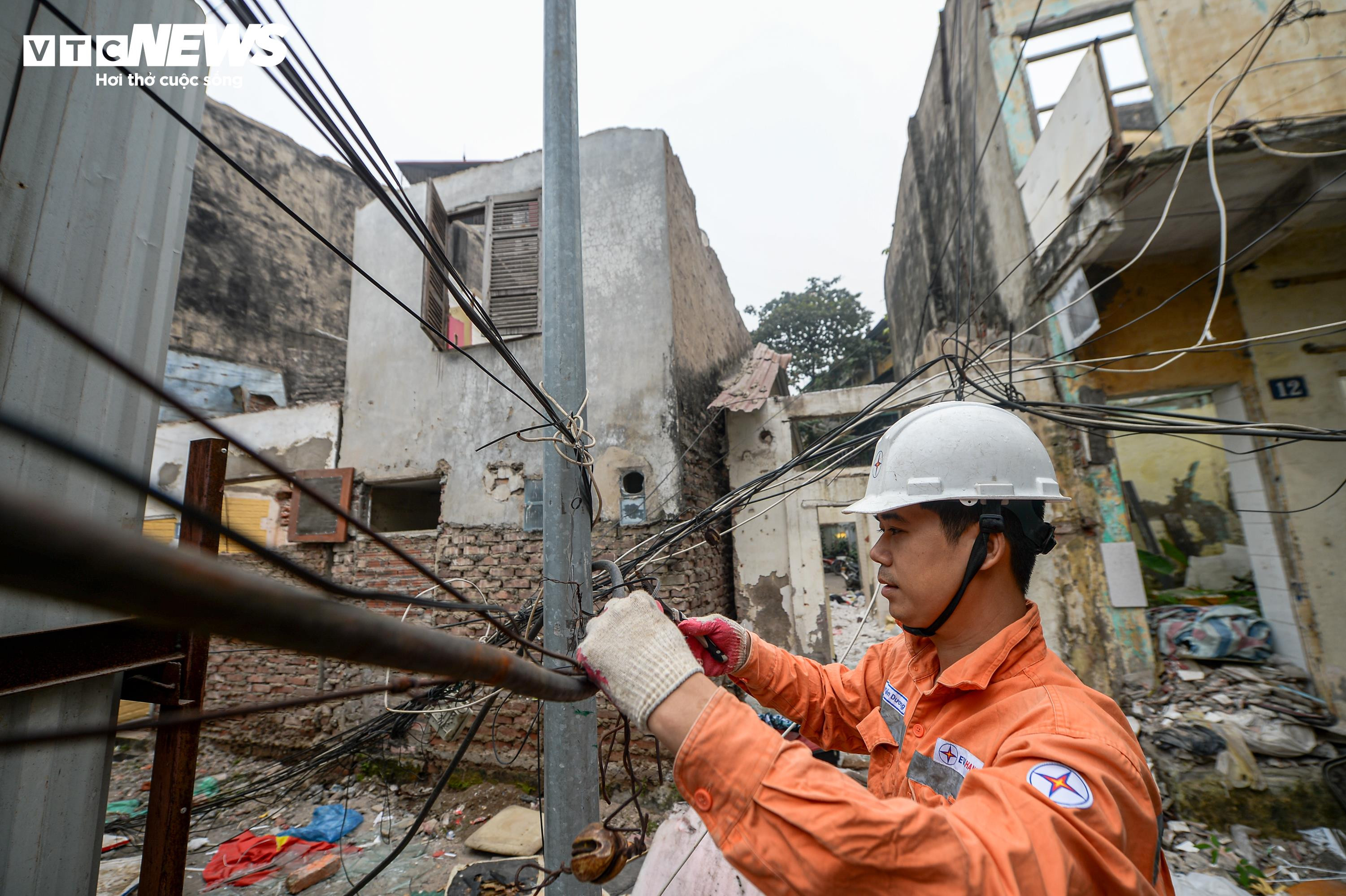 Nhân viên điện lực cũng có mặt để thu hồi dây dẫn, công tơ và tháo dỡ hệ thống điện, đảm bảo an toàn trước khi máy móc tiếp tục phá dỡ.
