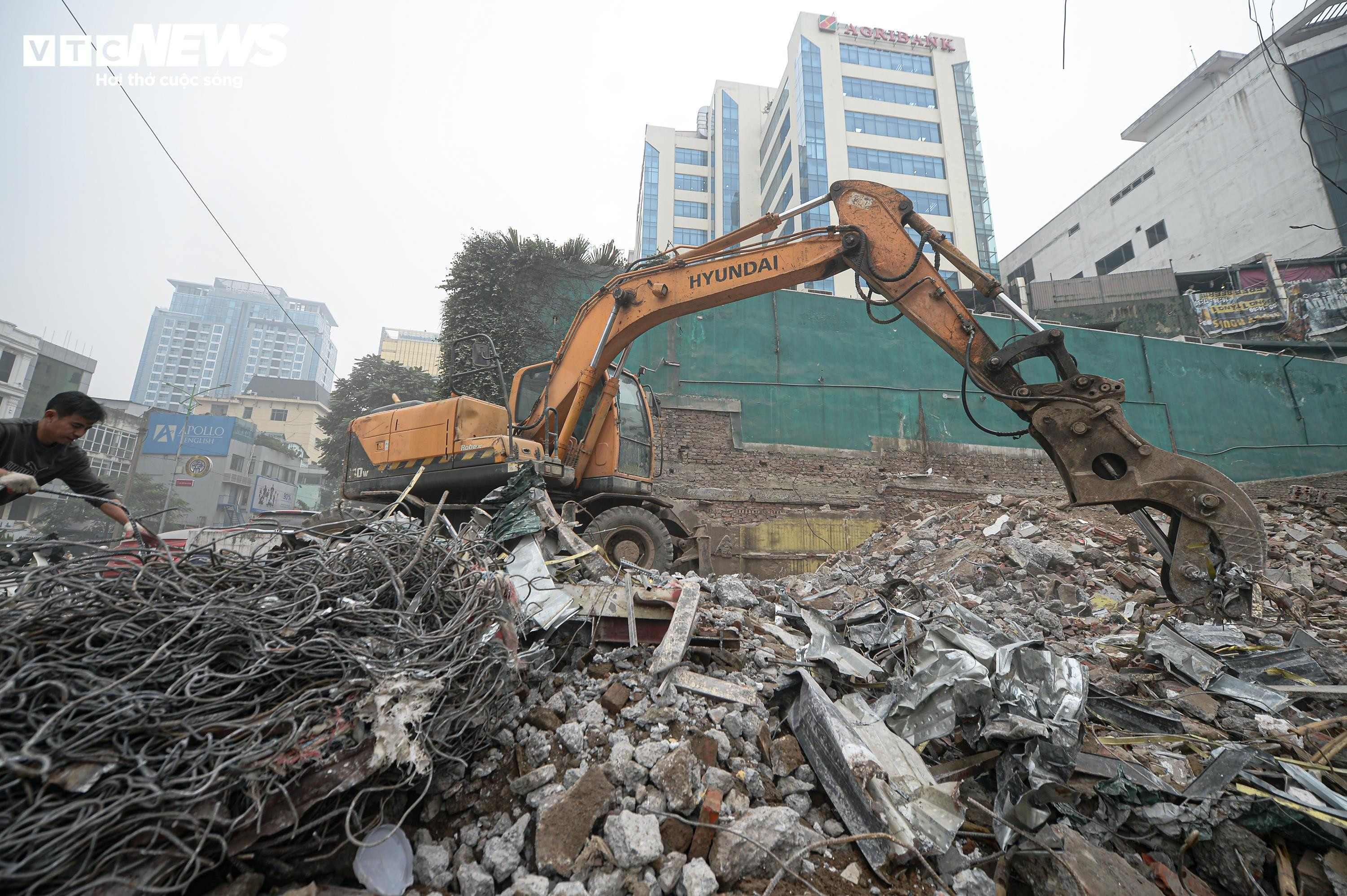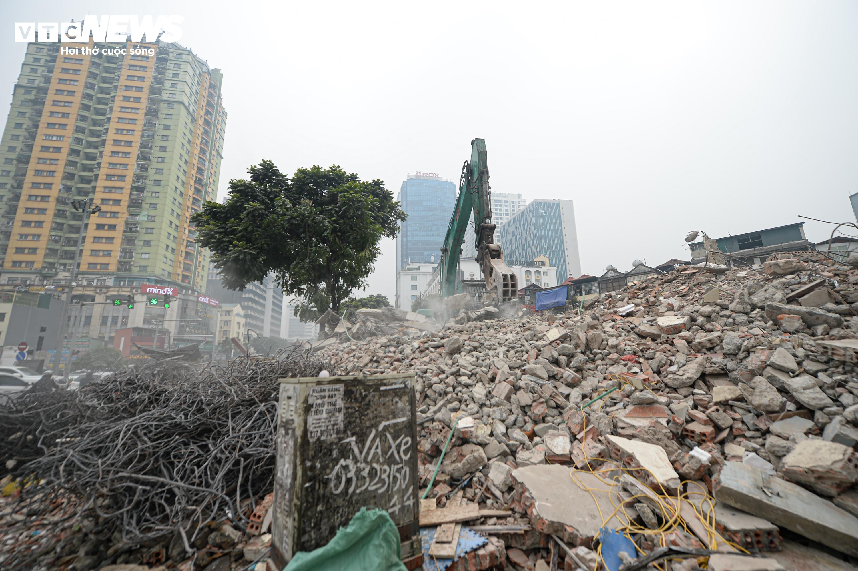 Hàng chục công nhân cùng máy khoan bê tông, máy cắt, máy xúc hoạt động liên tục, phá dỡ từng dãy nhà mặt phố.