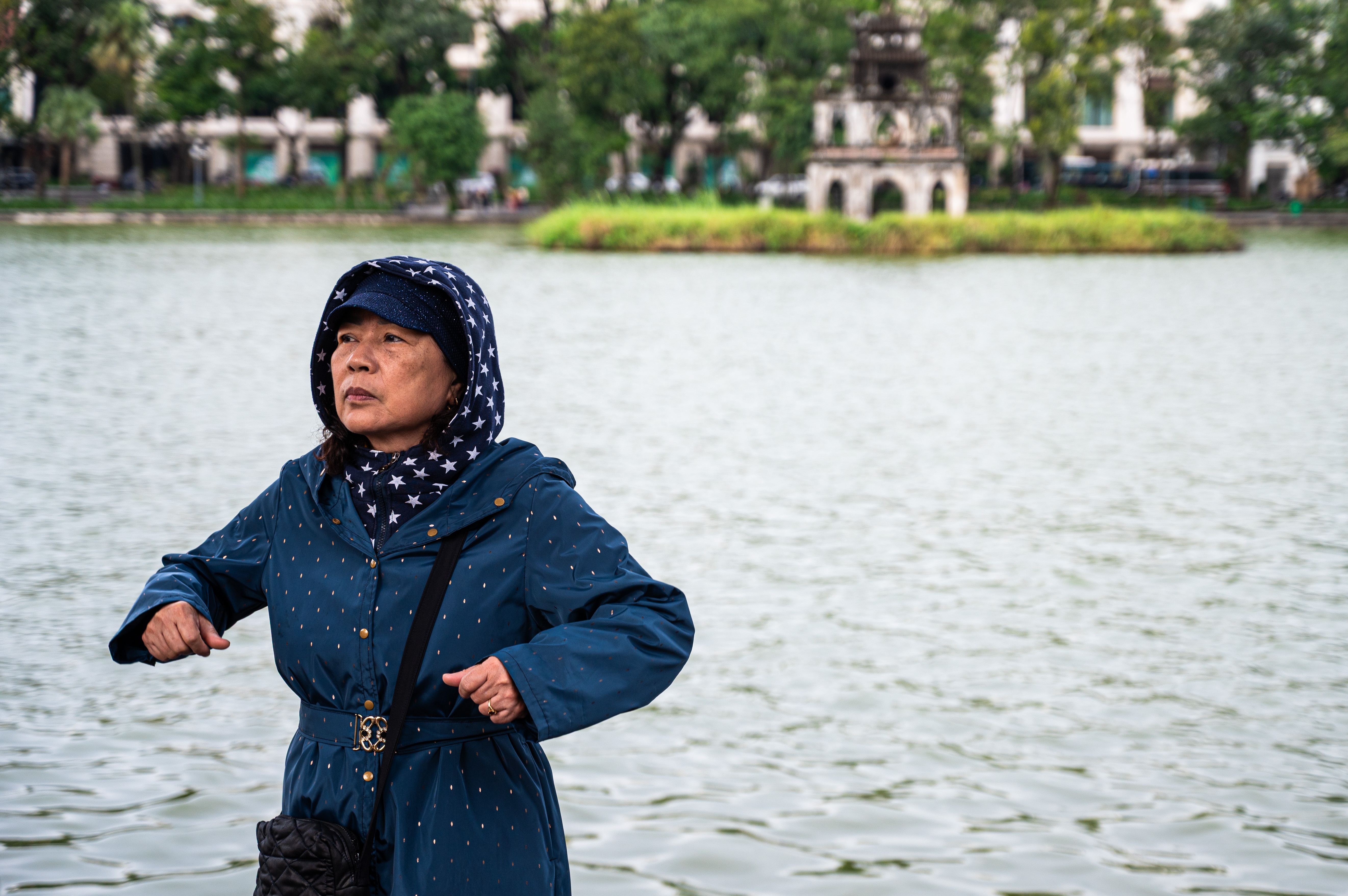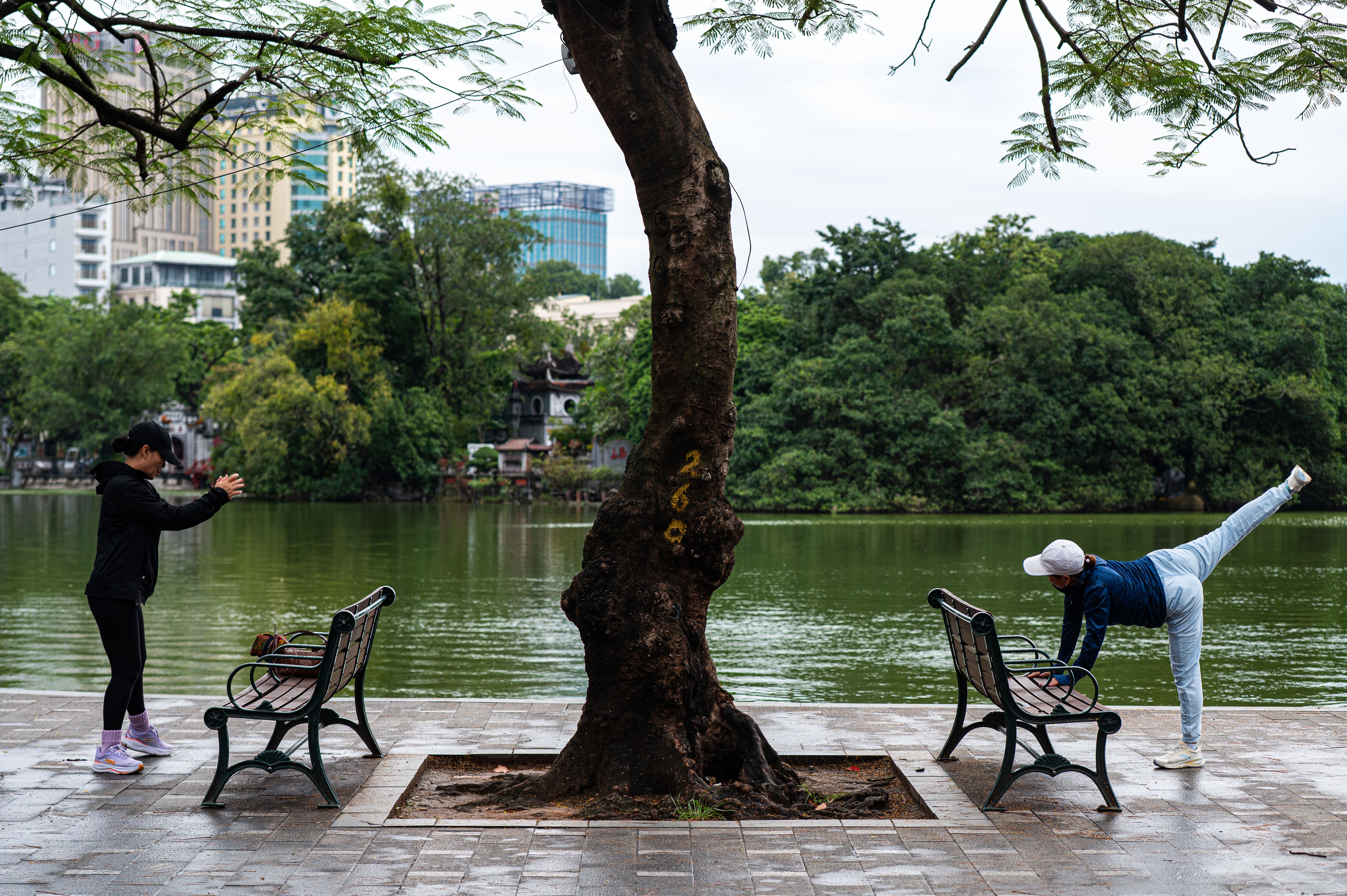 Mưa lạnh, nhiệt độ xuống thấp khiến hồ Hoàn Kiếm vắng vẻ hơn thường ngày. Lối đi chỉ còn lác đác người dân khoác áo mưa tập thể dục trong tiết trời rét đậm.