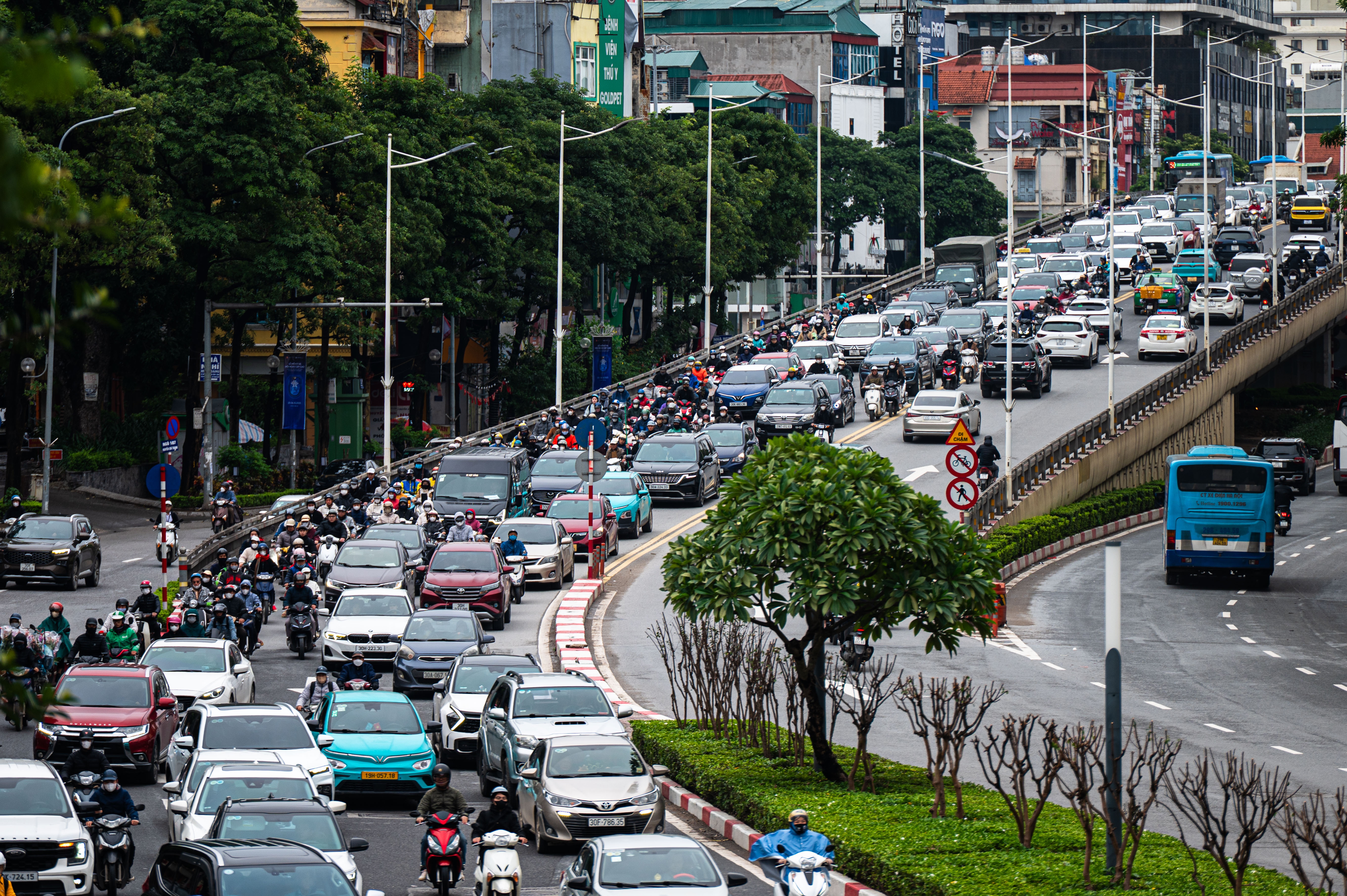 Phố Giảng Võ tắc nghẽn, xe cộ di chuyển chậm chạp, nhiều xe máy tràn vào làn đường BRT.