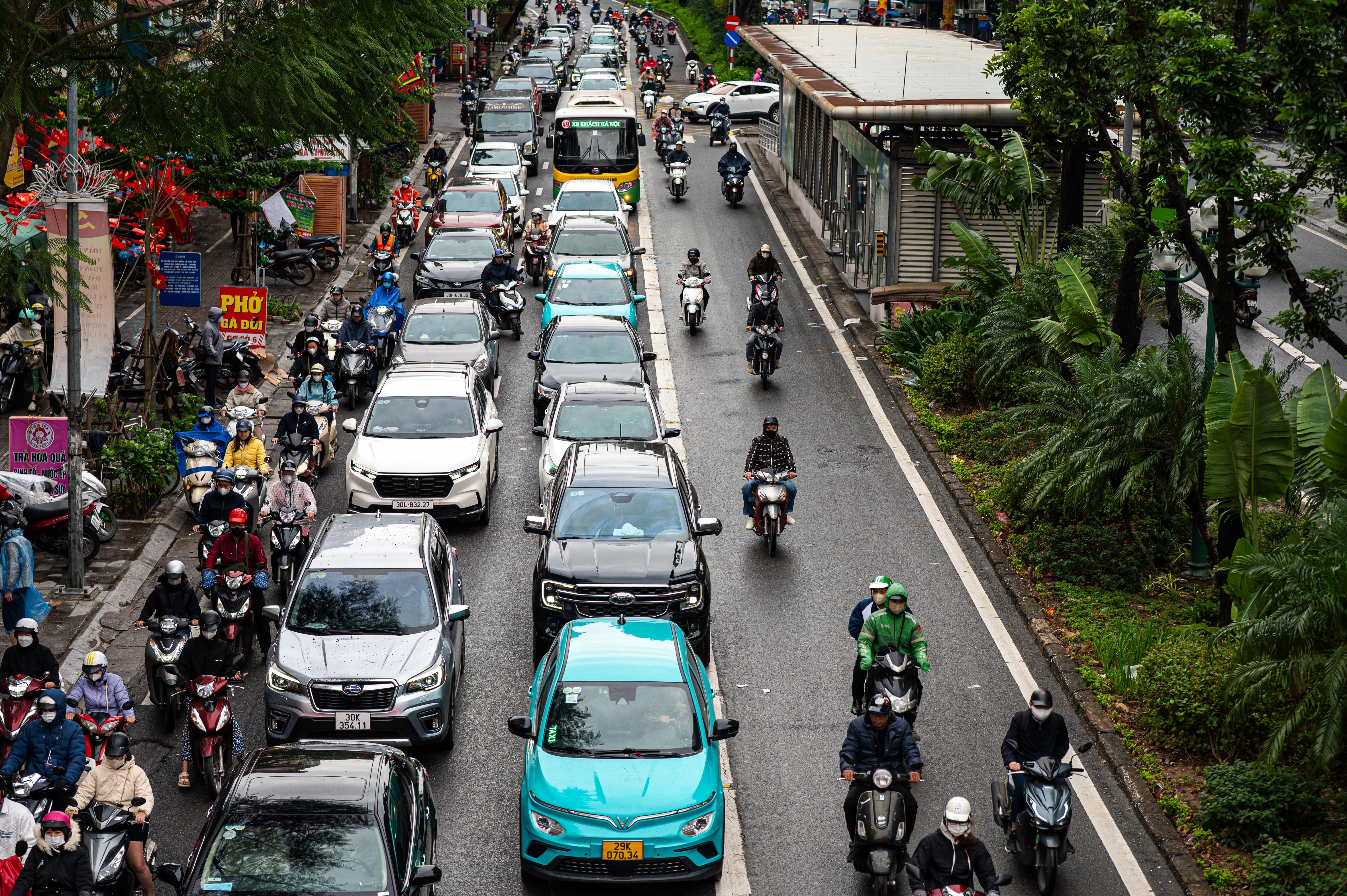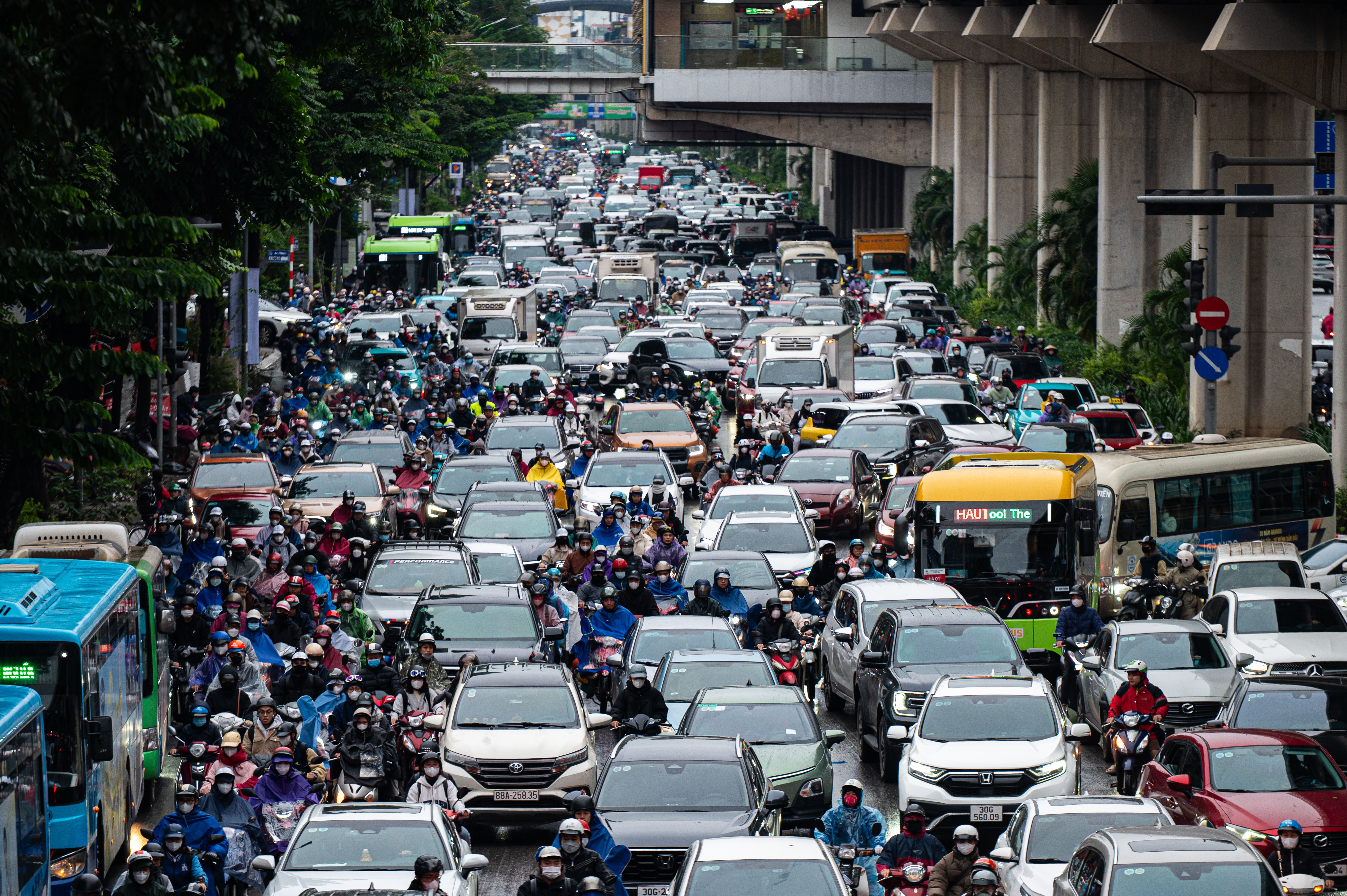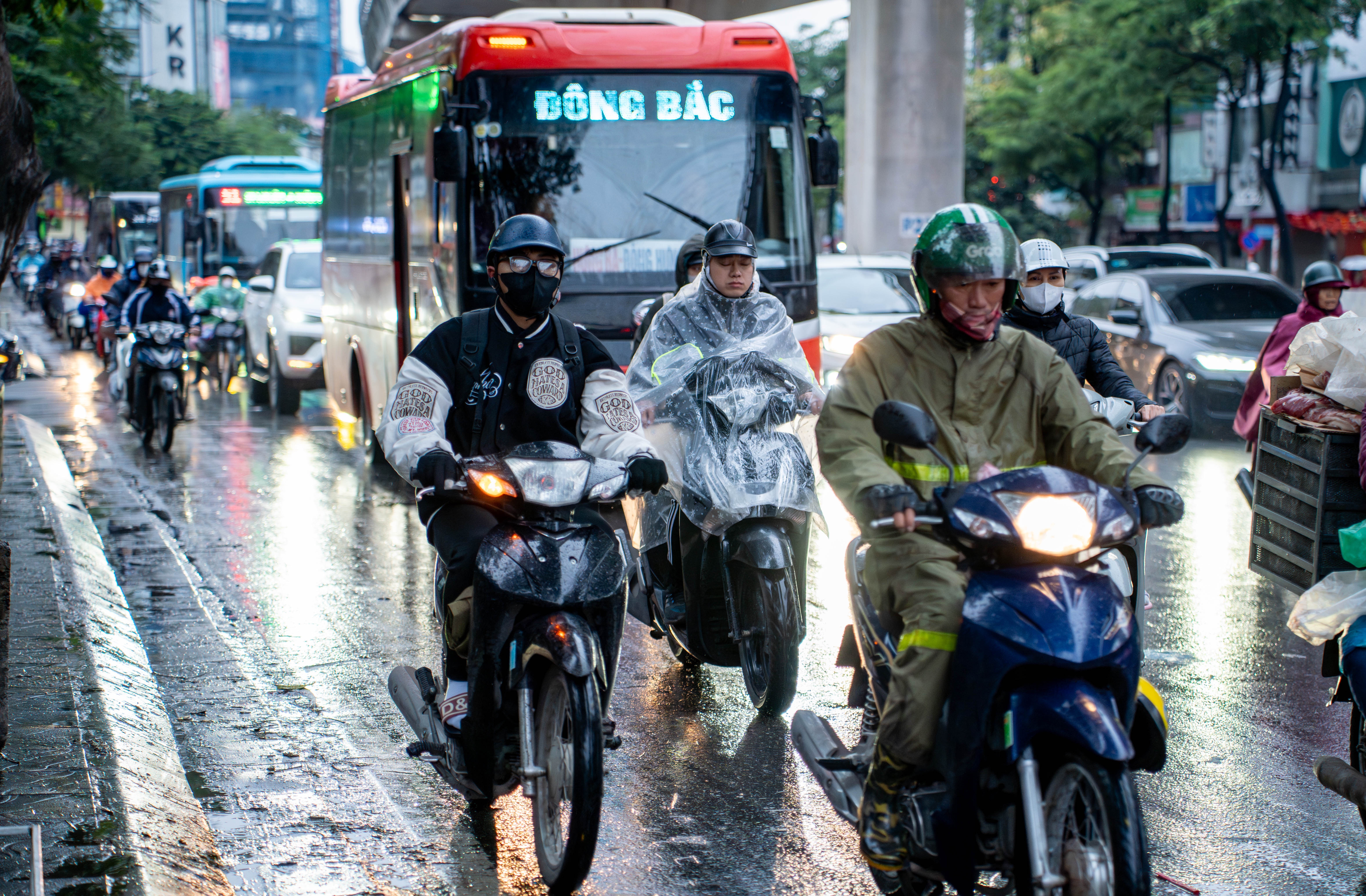 Các tuyến đường như Kim Mã, Lê Văn Lương, Láng, Trần Duy Hưng... chật cứng phương tiện, dòng xe nối đuôi nhau di chuyển từng mét trong mưa rét, gây khó khăn cho người tham gia giao thông.