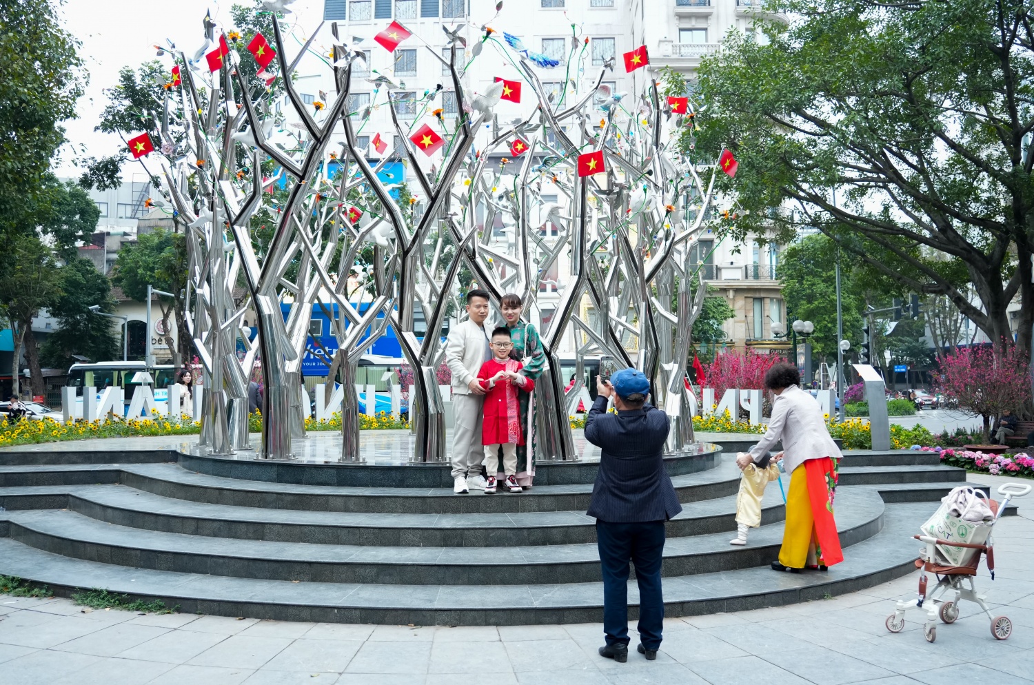 Tại Vườn hoa Lý Thái Tổ, nơi được trang hoàng rực rỡ với đào, quất và tiểu cảnh xuân, nhiều gia đình tranh thủ ghi lại khoảnh khắc đầu năm. Những bức ảnh chụp bên sắc hoa, bên tượng đài, hay bên thảm cỏ xanh mướt như lưu giữ trọn vẹn không khí Tết của đất Kinh Kỳ. Không khí nơi đây không ồn ào mà mang sắc thái thư thái, đúng tinh thần du xuân đầu năm: nhẹ nhàng, an nhiên.