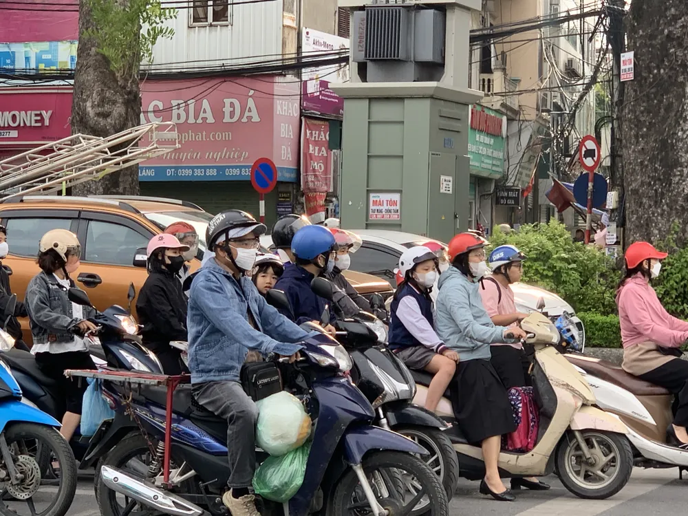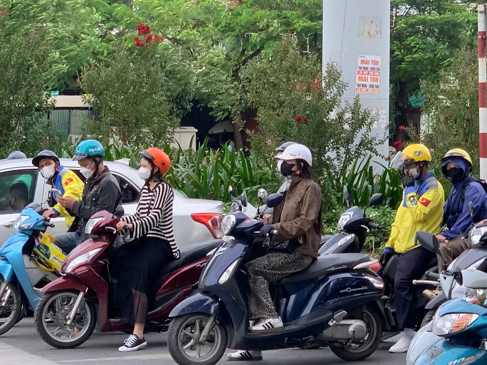 Tại các quận nội thành như Cầu Giấy, Thanh Xuân, Đống Đa, từ 6 giờ sáng, nhiều người đi làm bằng xe máy đã phải mặc áo gió hoặc khoác thêm áo len mỏng. Nhiều phụ huynh đưa con đi học cũng chủ động mặc thêm áo ấm cho con.