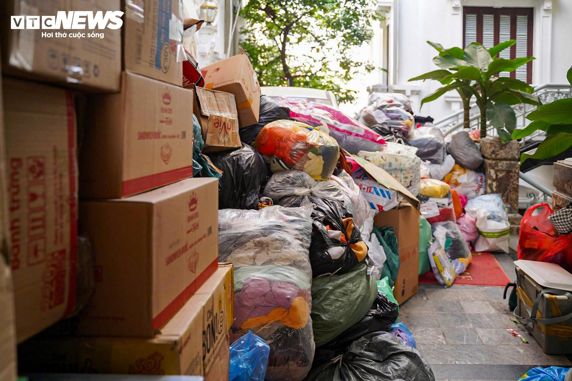 Tại khu tập kết trên phố Xuân Diệu, không khí làm việc diễn ra nhộn nhịp. Người mang đồ đến không chỉ gửi rồi về, mà còn ở lại hỗ trợ phân loại.