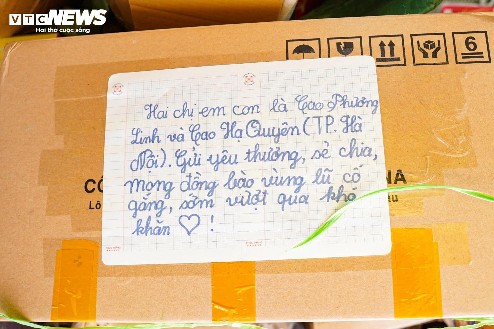 Mọi người đóng gói lương thực, chăn màn, quần áo, rồi cẩn thận ghi nhãn theo từng kích cỡ để đảm bảo hàng hóa đến tay bà con vẫn nguyên vẹn và thuận tiện sử dụng.