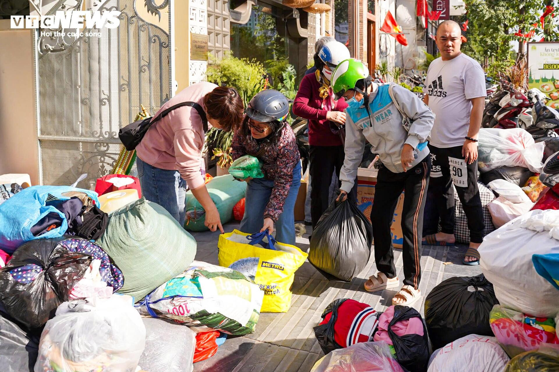 Điểm tập kết trong ngõ 58 Trần Bình cũng ghi nhận lượng người đến ủng hộ tăng liên tục. Hàng hóa sau khi tiếp nhận được xếp ngay lên xe tải nhỏ, chờ gom đủ số lượng để chuyển tới kho trung tâm trước khi vận chuyển vào miền Trung. Theo chia sẻ của thành viên các nhóm thiện nguyện, đồ cứu trợ chủ yếu là lương thực, quần áo, chăn màn và các nhu yếu phẩm.