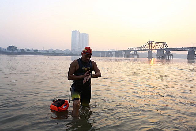 Mỗi ngày từ 5 giờ 30 đến 6 giờ sáng, tại khu vực sông Hồng gần cầu Long Biên vẫn có người xuống nước bơi lội, bất chấp thời tiết lạnh những ngày gần đây.