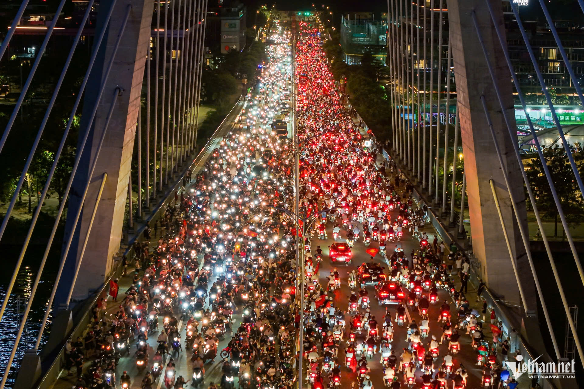 Từ trên cầu Ba Son xuống các tuyến đường ven sông Sài Gòn rợp một màu đỏ của cờ Tổ quốc và đèn phanh xe máy.