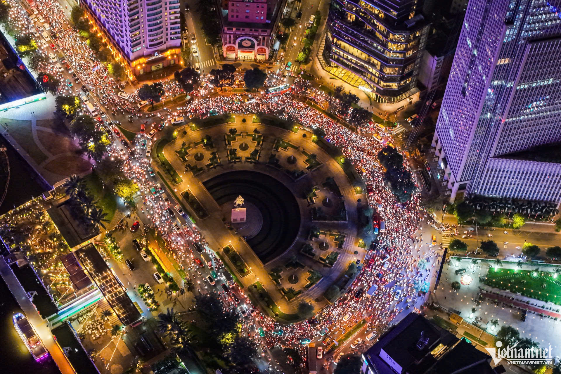 Dòng người đi bão nối dài từ phố đi bộ Nguyễn Huệ ra đường Tôn Đức Thắng và công trường Mê Linh.