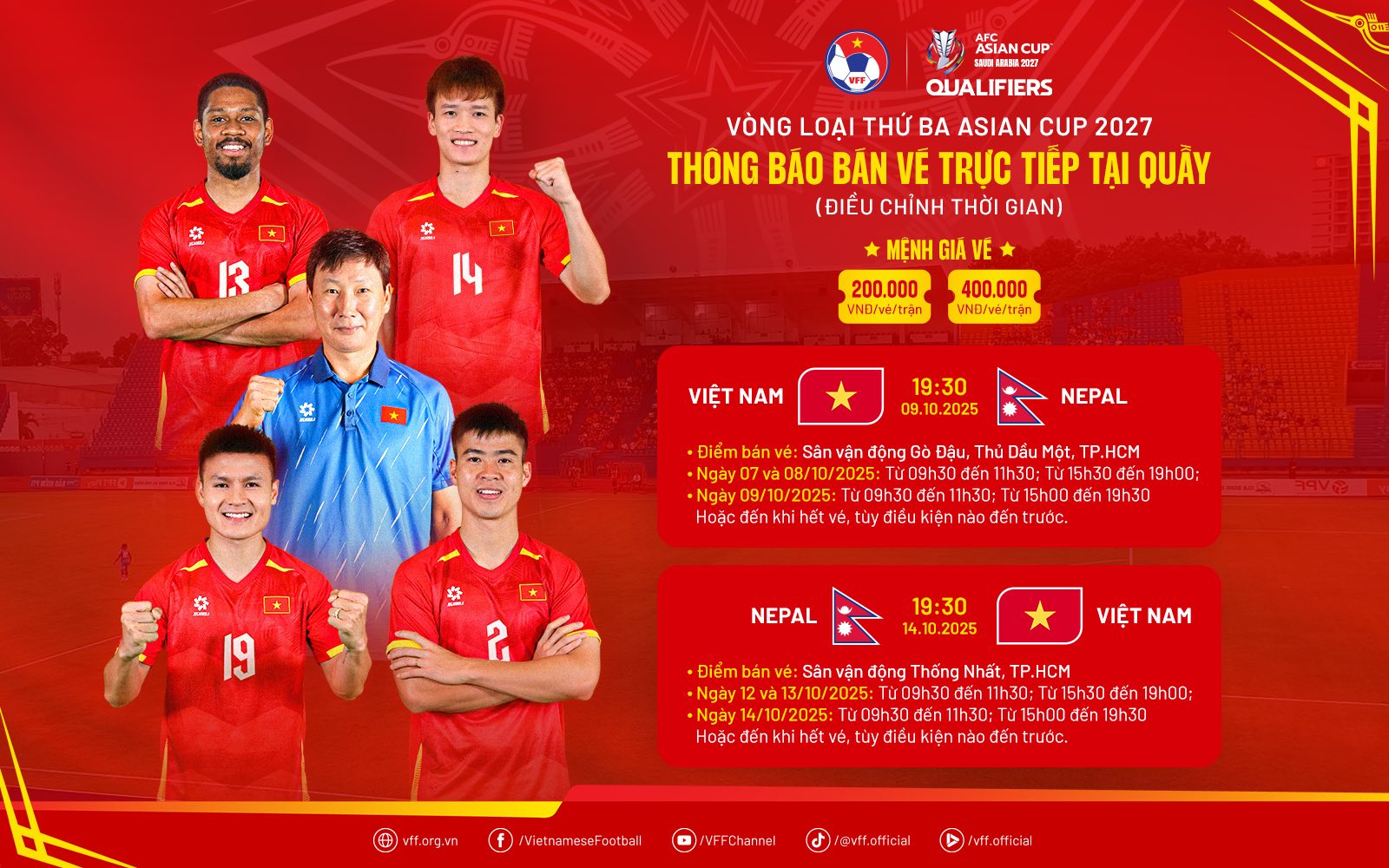 Kế hoạch bán vé xem hai trận đấu của đội tuyển Việt Nam và Nepal tại vòng loại Asian Cup 2027. ẢNH: VFF