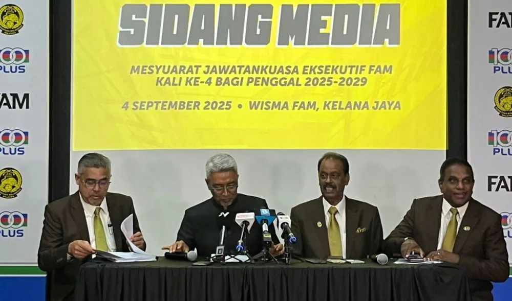 Phó chủ tịch FAM Datuk Sivasundaram cùng các cộng sự chưa có câu trả lời thỏa đáng cho người hâm mộ Malaysia về nguồn gốc của 7 cầu thủ nhập tịch. Ảnh: TNST.