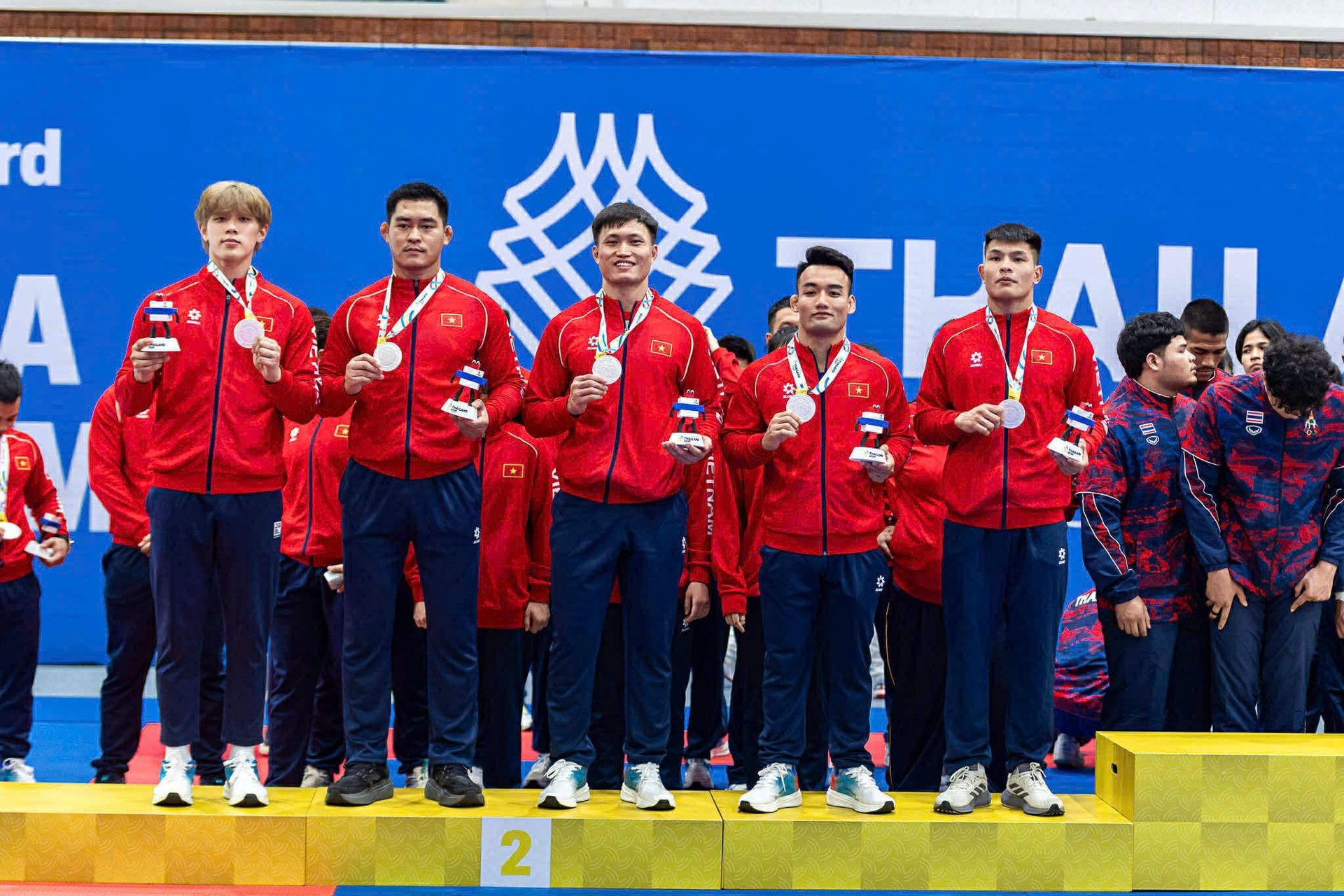 Lê Minh Nhựt (thứ hai từ trái sang) trên bục nhận huy chương bạc tại SEA Games 2025.