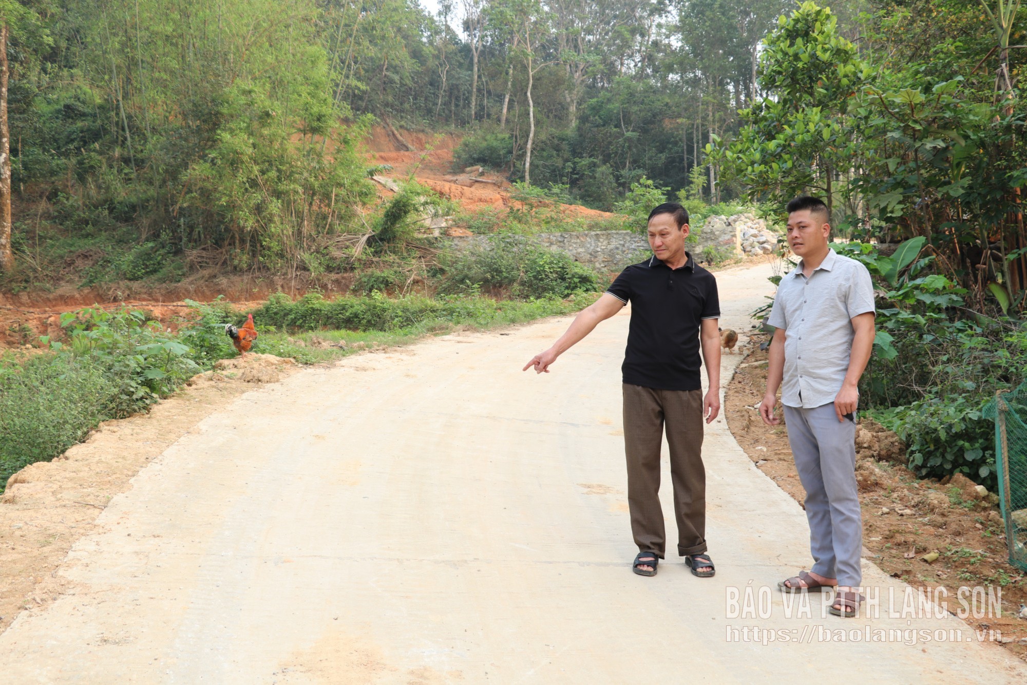 Ông Triệu Nho Tiên (bên trái) trên con đường bê tông kiên cố được xây dựng trên diện tích hiến đất của gia đình