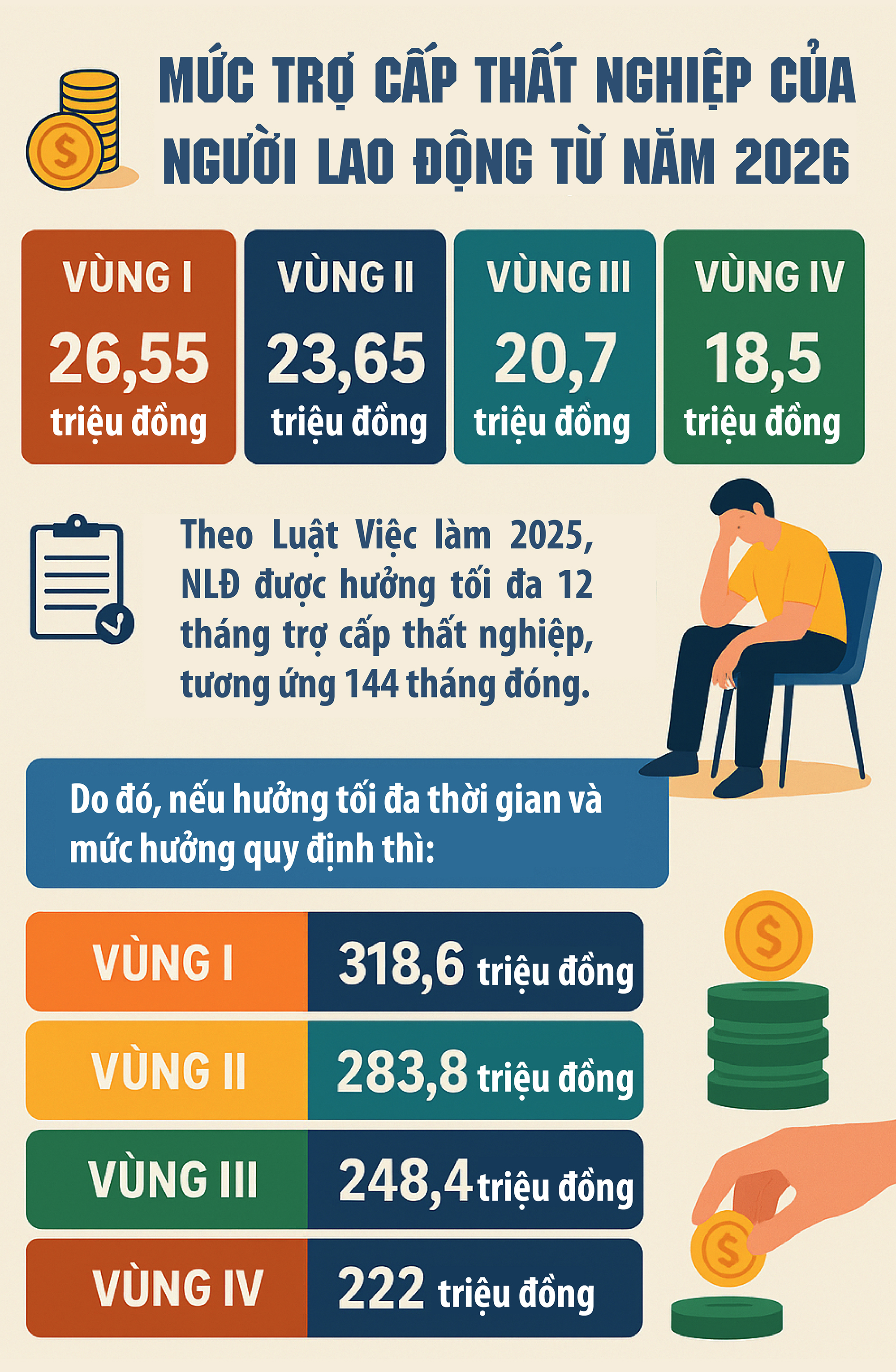 Như vậy, mức trợ cấp thất nghiệp mà người lao động được nhận từ năm 2026 như sau: