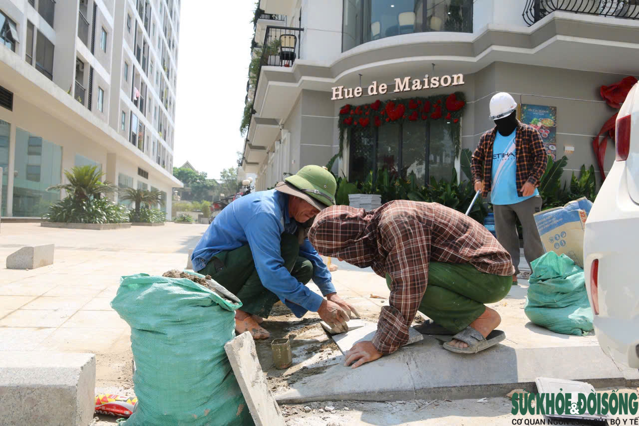 Không chỉ lao động bốc vác, nhiều người làm việc ngoài trời khác cũng đang chật vật chống chọi nắng nóng. Tại một công trình xây dựng ở phường Thành Vinh, ông Nguyễn Xuân Sinh (53 tuổi, trú xã Lam Thành) cùng nhóm thợ tranh thủ làm từ sớm.