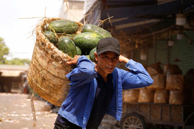 Gần 11 giờ trưa, khi mặt đường hầm hập hơi nóng, ông Nguyễn Xuân Hùng (67 tuổi, trú phường Thành Vinh) vẫn còng lưng chở hàng giữa cái nắng hơn 40 độ C. "Nắng kinh khủng, nhưng có người gọi là phải đi. Nghỉ thì lấy gì mà sống", ông Hùng nói, giọng khàn đặc.