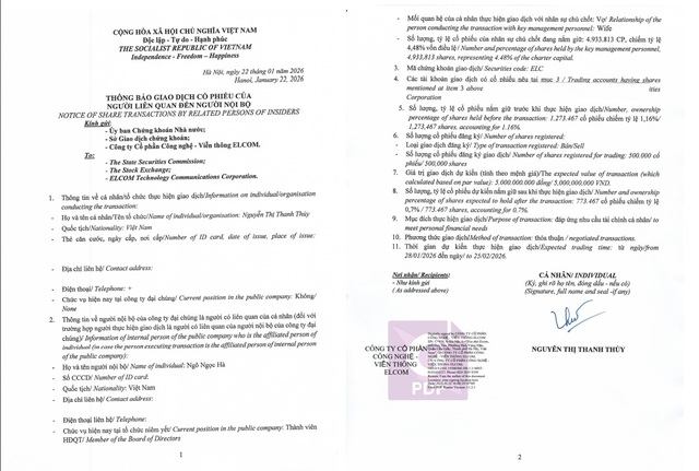 Thời gian thực hiện giao dịch dự kiến từ ngày 28/1/2026 đến ngày 25/2/2026. Nếu hoàn tất bán cổ phiếu, bà Nguyễn Thị Thanh Thủy sẽ giảm tỷ lệ cổ phần nắm giữ tại ELCOM từ 1,16% xuống còn 0,7%.