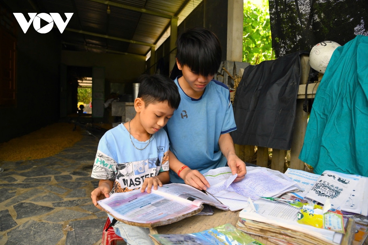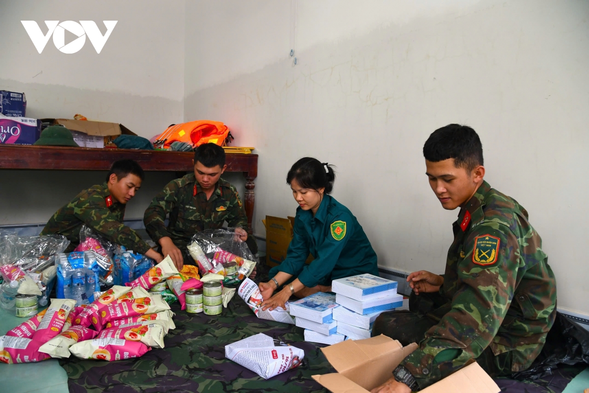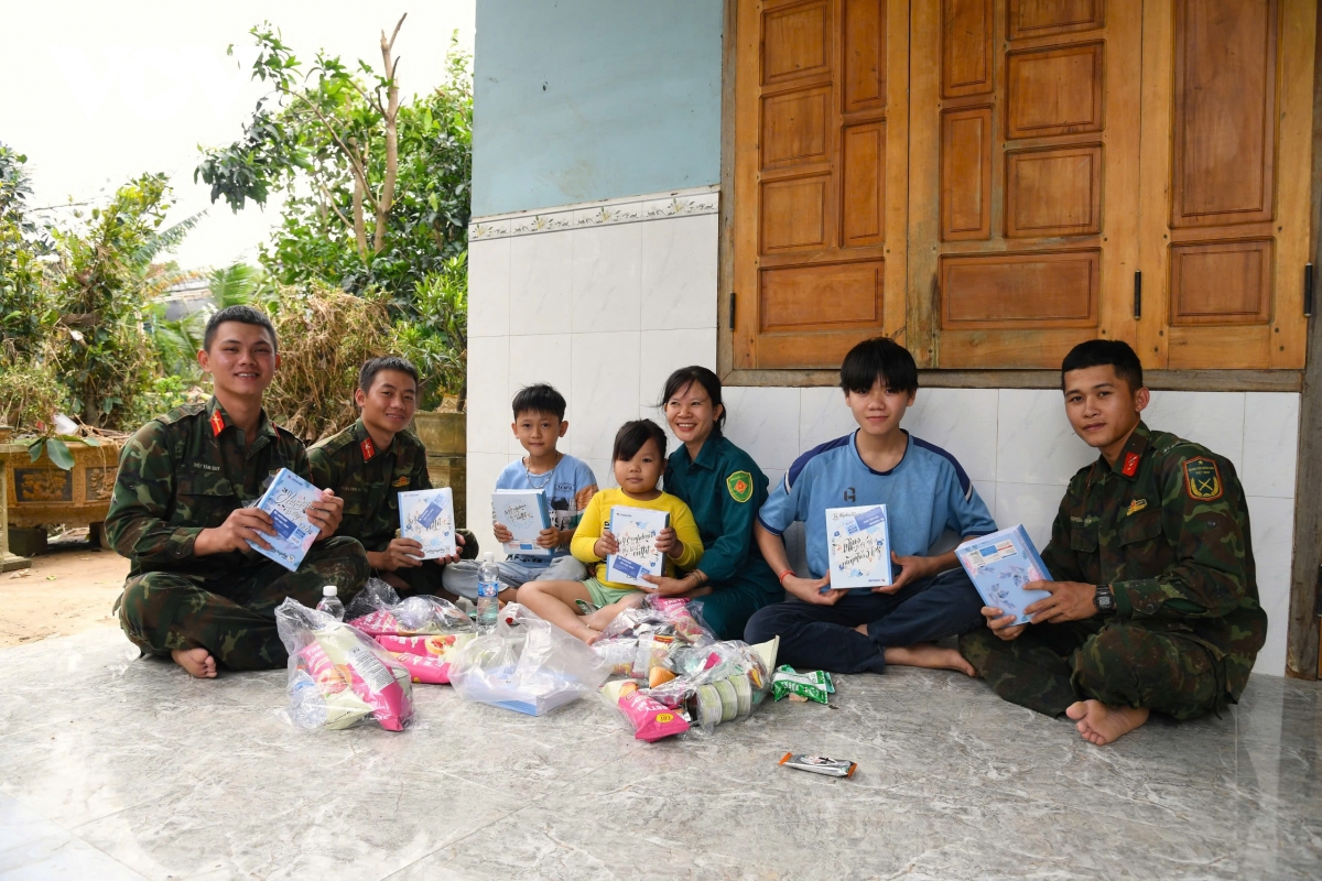 Lũ cuốn trôi sách vở, bút thước của hầu hết học sinh. Hiểu nỗi mất mát ấy, trong những giờ nghỉ trưa hiếm hoi, chiến sĩ Trung đoàn 95 góp chút phụ cấp ít ỏi mua sách, vở, bút viết để tặng các em. Tại Ban Chỉ huy Quân sự xã Tuy An Đông, chiến sĩ Sư đoàn 2 cùng dân quân xã người gói bánh kẹo, người xếp vở, bút… Những món quà tuy giản dị nhưng chứa đựng tình cảm chan chứa của người lính gửi đến các em nhỏ mong sớm trở lại lớp. Hạ sĩ Nguyễn Gia Huy, quê ở xã Sông Hinh (Đắk Lắk), chia sẻ: “Nhà em cũng bị ngập, mấy đứa nhỏ trôi hết sách vở, nên em hiểu hoàn cảnh của các em lắm. Có thể góp chút gì đó để các em đi học lại, em vui lắm”.