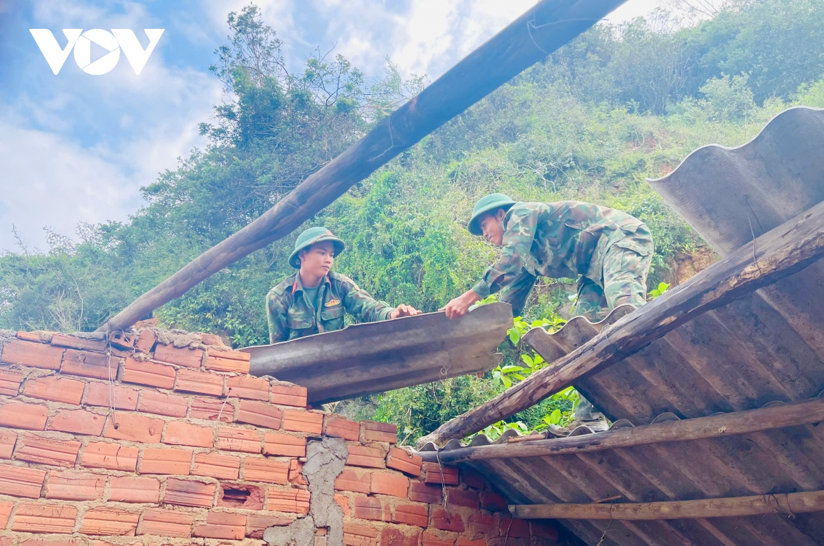 Bộ đội giúp dân lợp tạm lại mái nhà