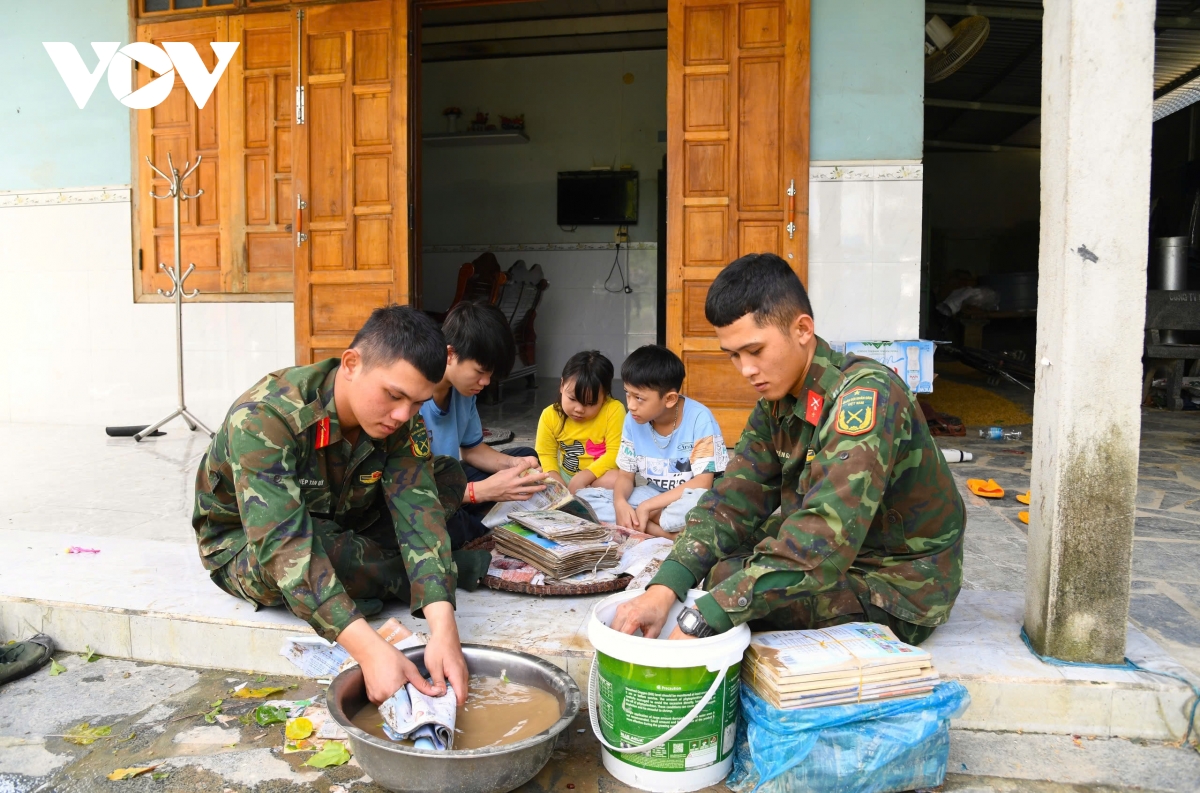 Cán bộ, chiến sĩ giúp học sinh lau sạch bùn đất bám trên những tập sách vở