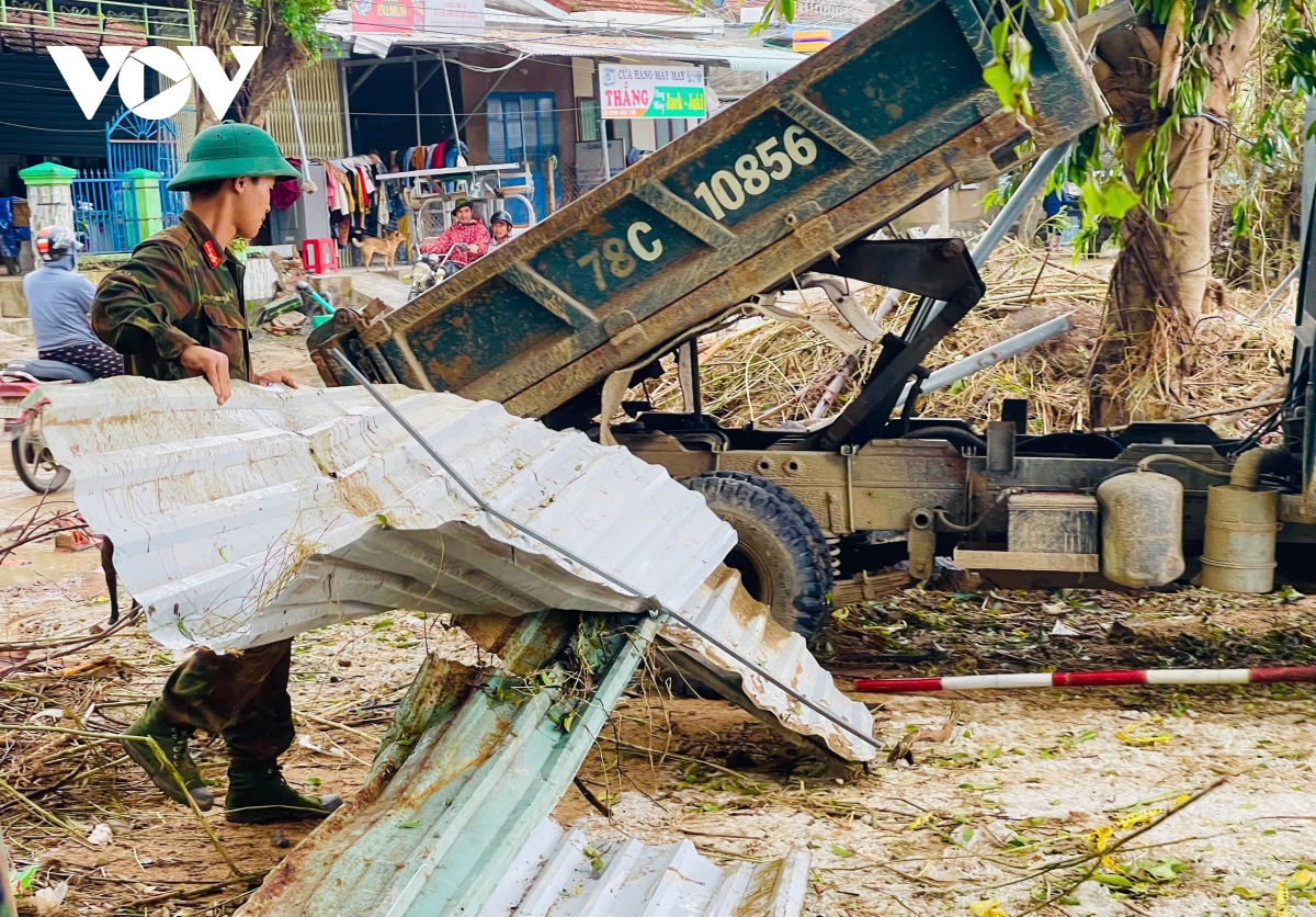 Cán bộ ,chiến sĩ Trung đoàn 95, Sư đoàn 2 - Quân khu 5 giúp nhân dân xã Tuy An Đông khắc phục hậu quả