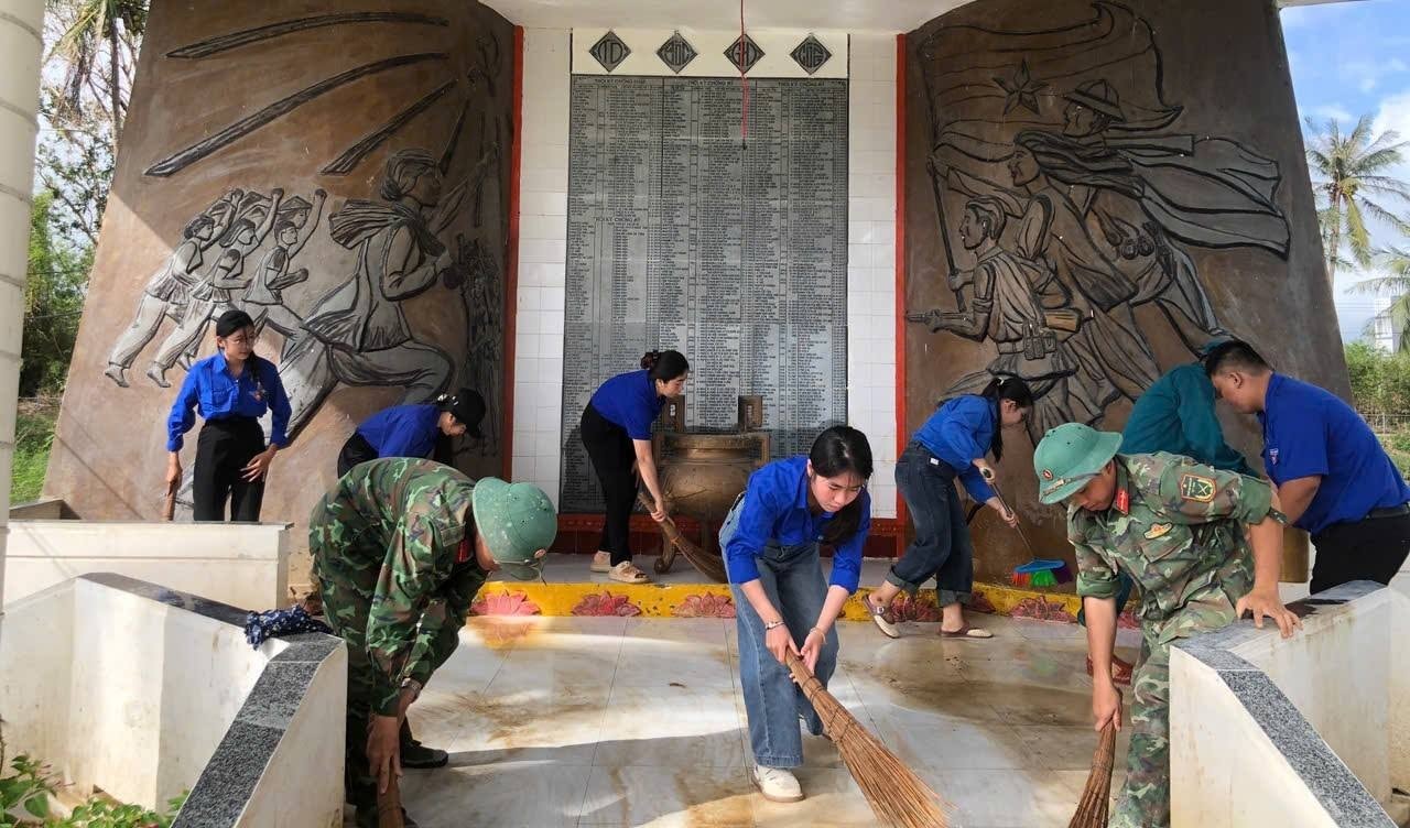 Cán bộ, chiến sĩ Sư đoàn 2 cùng thanh niên địa phương dọn dẹp nghĩa trang liệt sĩ. Ảnh: THF2
