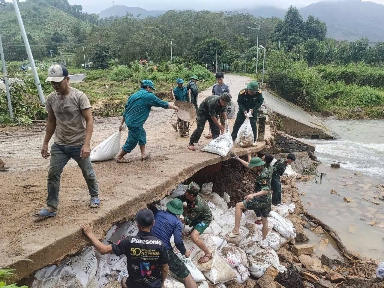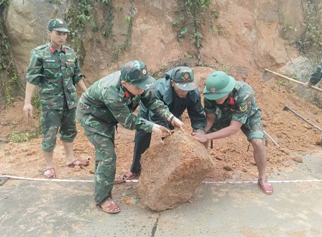 Cán bộ, chiến sĩ Trung đoàn 108 tổ chức, triển khai lực lượng khắc phục tình trạng sạt lở hơn 3km với khối lượng hàng chục mét khối đất đá nhằm đảm bảo an toàn cho người và phương tiện lưu thông trên địa bàn xã Cam Hiệp, tỉnh Khánh Hòa ngày 24-11. Ảnh: V.Nam