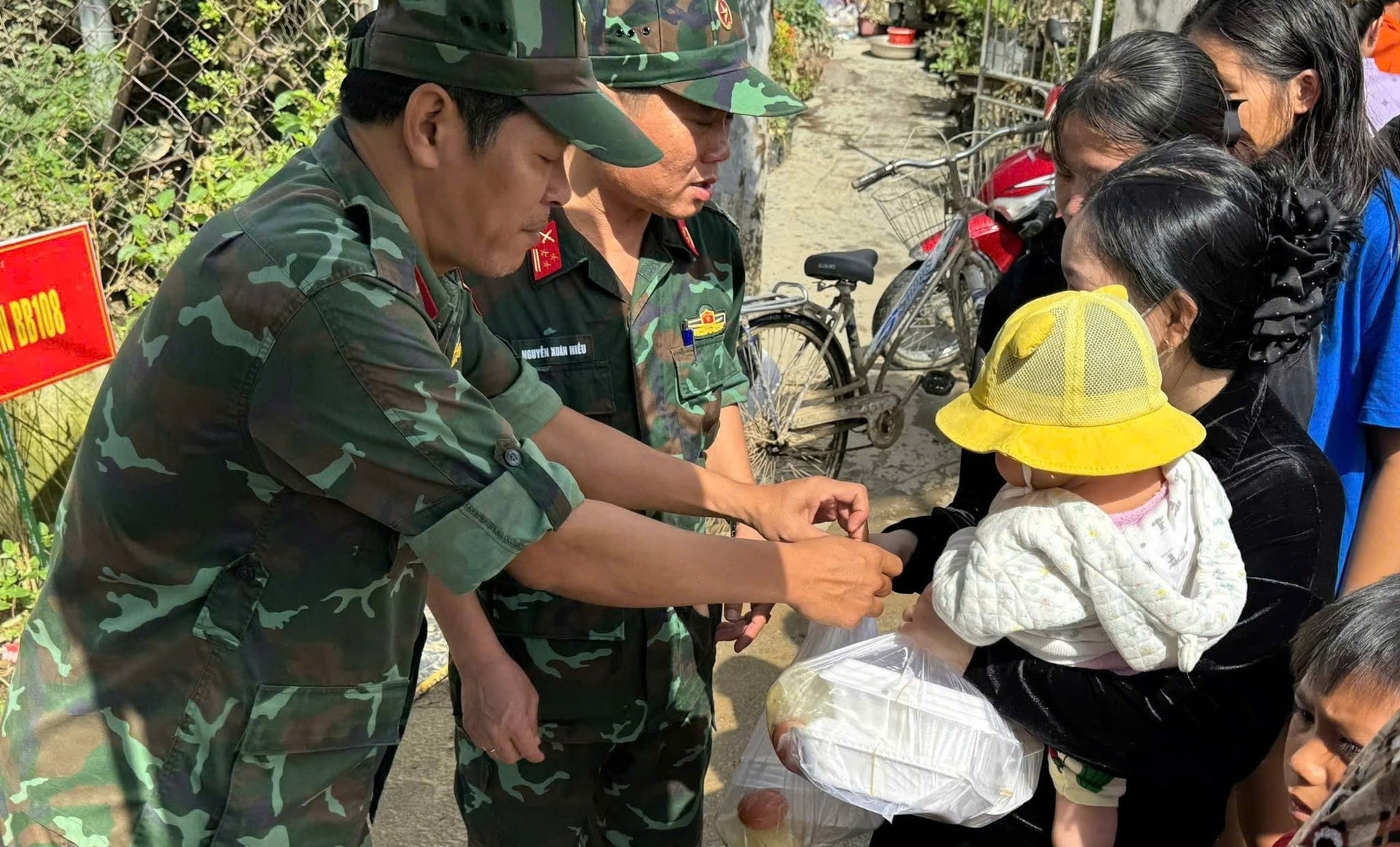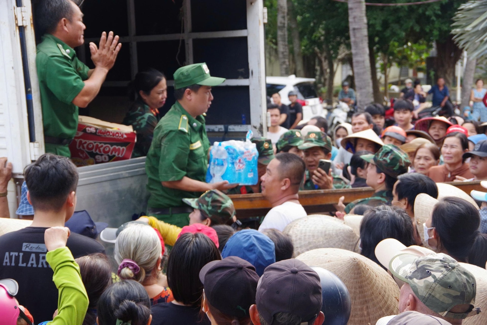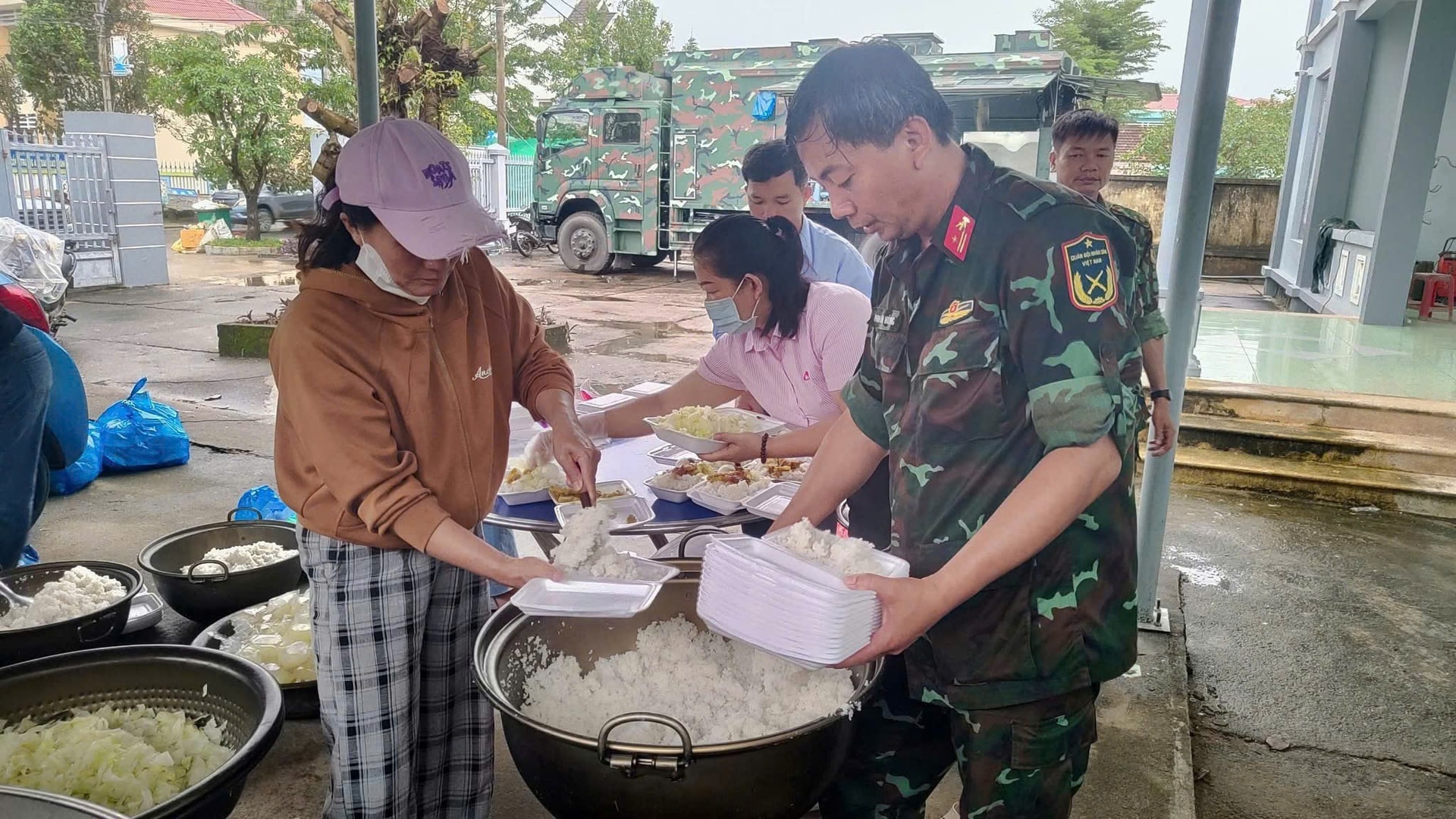 Trung đoàn 108 huy động nguồn lực từ cán bộ, chiến sĩ trong đơn vị và các nhà hảo tâm trên địa bàn tổ chức nấu ăn và trao 550 suất cơm cho bà con nhân dân tại các xã Suối Dầu, Suối Hiệp và Diên Điền, tỉnh Khánh Hòa ngày 24-11. Ảnh: V.Nam