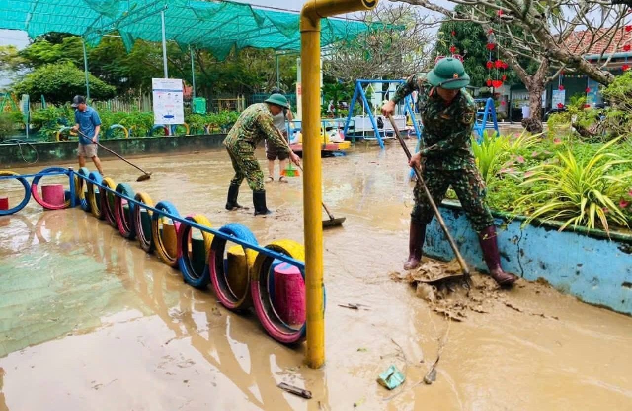 Sau khi nước lũ rút, điểm Trường Mầm non Ninh Quang và Trường THCS Quang Trung xã Thạnh Mỹ, tỉnh Khánh Hòa bị lớp bùn dày phủ kín nền, sách vở hư hỏng gần hết. Ngày 25-11, hàng chục cán bộ, chiến sĩ Trung đoàn Bộ binh 210 – Sư đoàn 305, Quân khu 5 cùng giáo viên chia nhau từng phần việc, từ cào bùn, rửa bàn ghế đến giữ lại những cuốn vở còn sót. Tất cả chỉ mong trường sạch lại nhanh nhất để học sinh sớm trở lại lớp. Ảnh: V.Nhân
