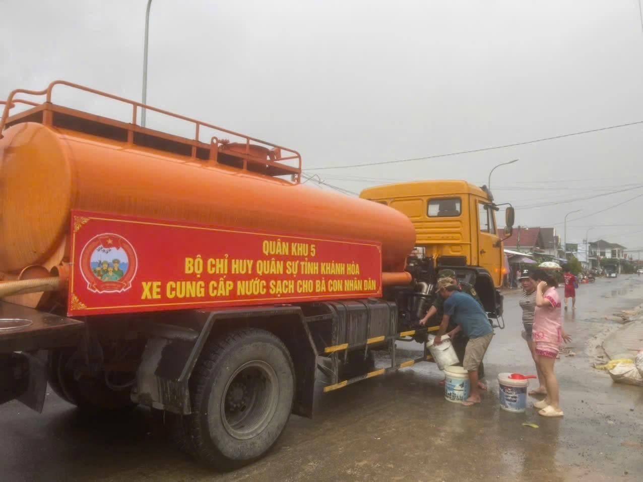Những chuyến xe bồn chở nước của Bộ CHQS tỉnh Khánh Hòa xuất hiện trên từng con hẻm, ngõ phố mang theo nguồn nước sạch cấp thiết và cả niềm tin đến với người dân vùng rốn lũ thôn Đông La, xã Diên Điền ngày 24-11. Ảnh: T.Tùng