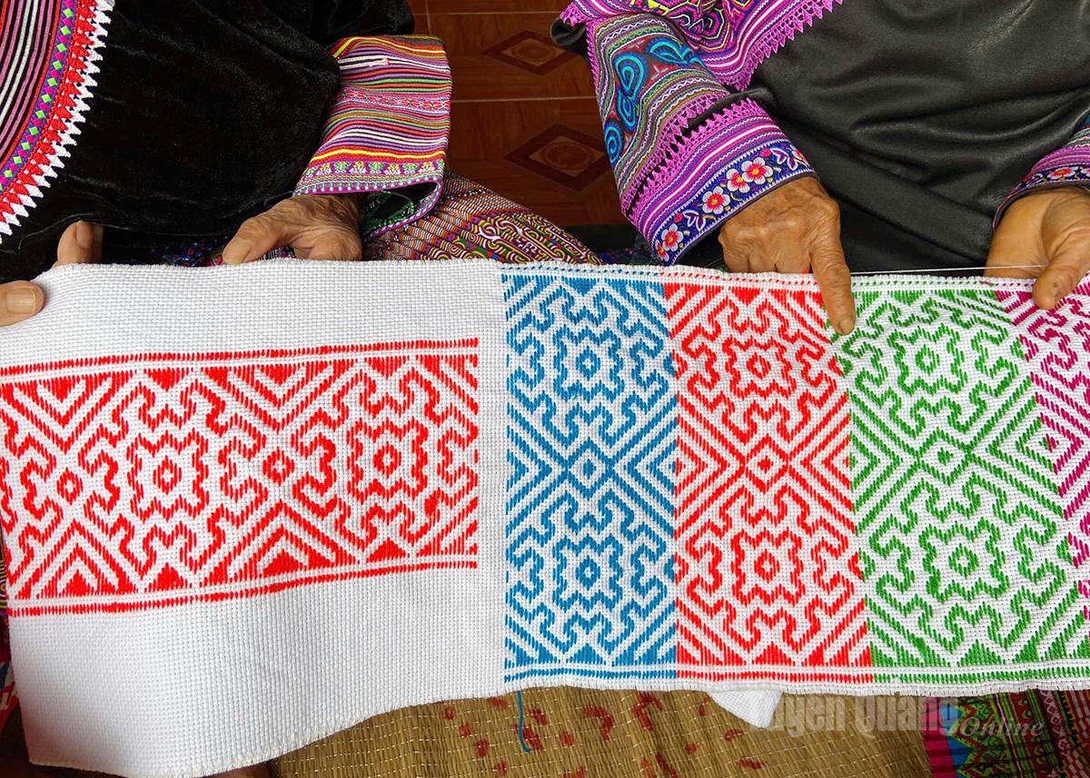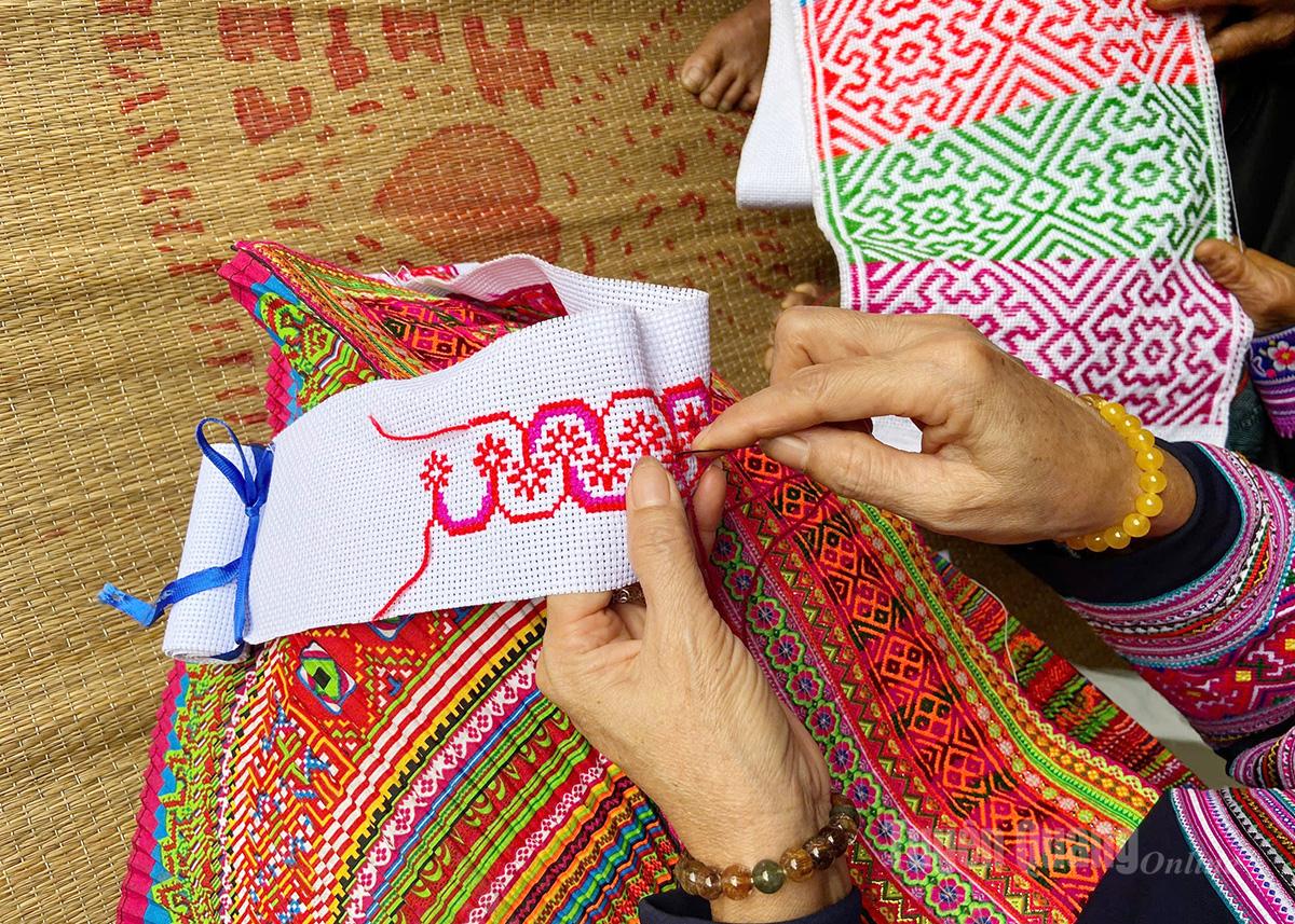 Bà Sùng Thị Sơ, năm nay đã 68 tuổi, nhưng vẫn tranh thủ những lúc nông nhàn, rảnh rỗi để thêu thùa. Bên cạnh bà luôn có chiếc túi xinh xắn, bên trong đựng kim chỉ và mảnh vải để có thời gian là bà lại tập trung thêu. Bà Sơ chia sẻ, từ năm lên 5 – 6 tuổi, bà đã được học thêu cơ bản, sau đó cứ nhìn các bà, các mẹ thêu để học theo. Chủ yếu là thêu yếm, đai váy, xà cạp cuốn chân. Cứ đến chợ phiên, chị em trong thôn lại tranh thủ mua vải, chỉ thêu để về làm. Bà thêu cho mình và các con, người thân trong gia đình, bởi chiếc váy của người phụ nữ Mông vốn đã sặc sỡ, nhiều màu sắc, trong đó chiếc yếm, đai váy, xà cạp cuốn chân chính là điểm nhấn. Mỗi đường kim, mũi chỉ đều thể hiện sự khéo léo của người mặc trang phục.