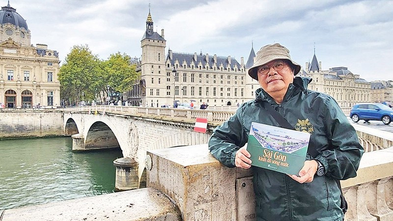 Tác giả Trần Hữu Phúc Tiến chụp ảnh kỷ niệm cùng quyển sách“Sài Gòn kinh đô sông nước” tại Pháp. (Ảnh CTV)